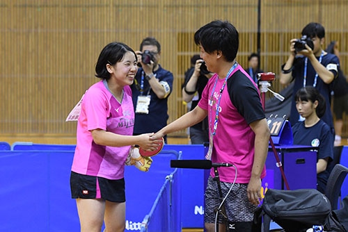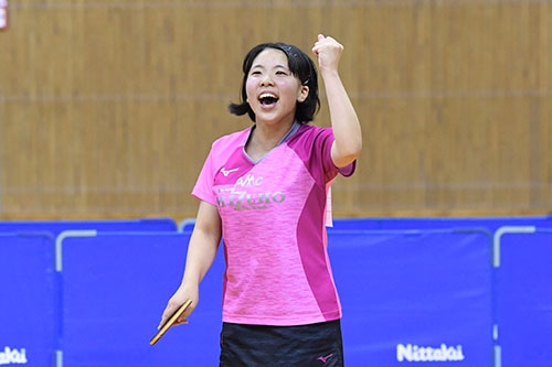 結局、野村のバックハンドの精度は最後まで落ちることがなく、第2、第3ゲームを圧倒してストレート勝利。野村は地元の大応援団の前で最高のプレーを披露し、最高の笑顔を見せた。