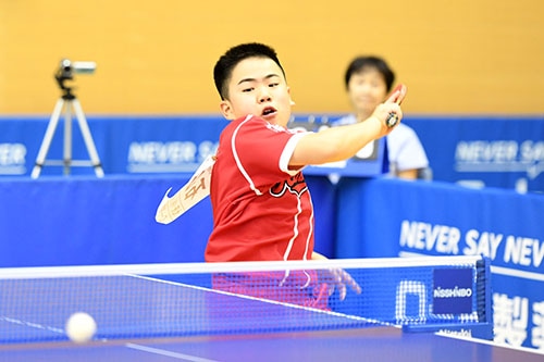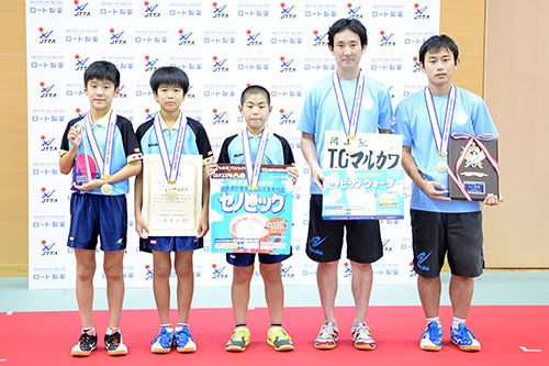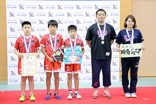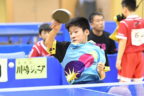 川嶋ジュニア(大阪)との決勝は、トップで丸川が登尾とのゲームオールジュースの激しい打ち合いを制して先制するも、2番の田畑は相手エース・石山の豪腕に2ゲーム先取から逆転で敗れ、1対1のタイに。しかし、3番の田畑/金光がストレートで快勝すると、4番の丸川が石山をゲームオールで退け、優勝を決めた。