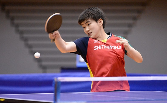 中森はミスの少ない大人びたプレーで表彰台 もう一方の3位には、四天王寺の主力の1人、中森が入った。バック面表ラバーの中森は、凡ミスが少なく、チャンスボールを見逃さずに得点に結びつける強さで、昨年のベスト8からワンランクアップ。準決勝の小塩戦では、バック面での短く止めるボールなどをうまく使って1ゲームを奪ったが、決め手に欠けて勝利にはいたらなかった。