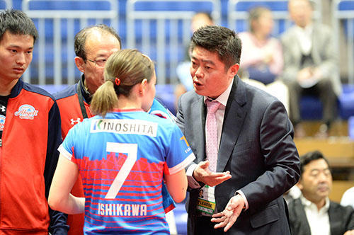 石川にアドバイスを送る邱総監督【木下アビエル神奈川】