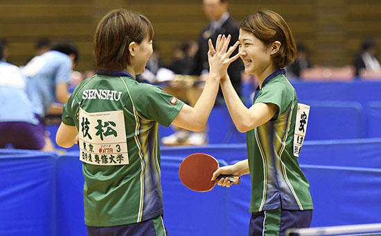 連覇を決め笑顔でハイタッチ女子ダブルスは安藤みなみ/枝松亜実(専修)が昨年に続き優勝を決めた。左右の異質攻守型というペアで、両者がチャンスを逃さずに決めるスタイルで、決勝では強豪の徳永/阿部(早稲田)にストレート勝ちを決めて連覇を決めた。