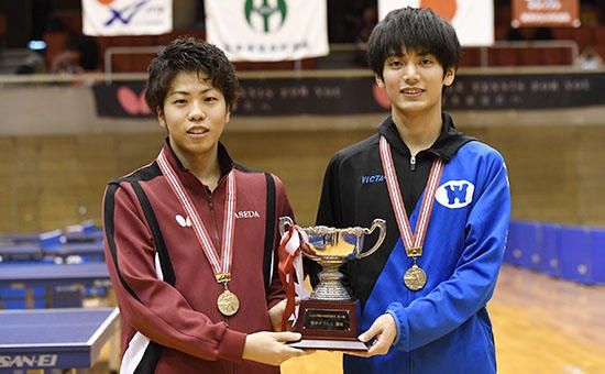 緒方のチャンスメークと硴塚の決定力の連係で得点を重ねた男子ダブルスは硴塚/緒方(早稲田)のエリートアカデミー出身ペアが、早稲田大に中野裕介/下山隆敬以来13年ぶりの男子ダブルスタイトルをもたらした。決勝では松下大星/宮本春樹(愛知工業)からマッチポイントを奪われながらも、あきらめないプレーで逆転勝ち。硴塚、緒方ともうれしい個人戦初タイトルを手にした。