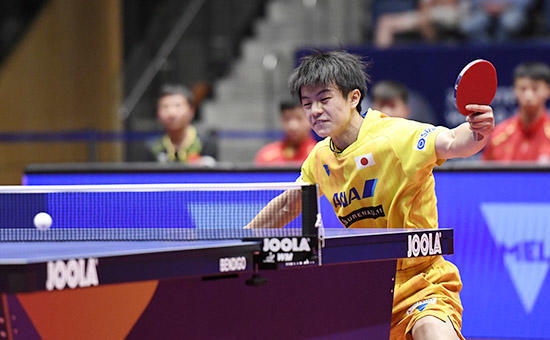 トップで田中佑汰がパワーでは随一の于何一と対戦。アグレッシブなチキータと相手のストップを果敢に攻める台上プレーで田中が先制。2ゲーム目も先にゲームポイントを奪ったが、逆転を許すと、于何一の逆横回転サービスからの展開に苦しめられ、続く2ゲームも于何一に奪われた。田中は終盤、回転量の多いチキータで相手の攻撃ミスを誘うなど工夫をするが、打ち合いになると、相手の高い決定力と固い守備に一歩及ばなかった。