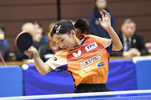 手足がすらりと長い本格派のカットマン13歳以下女子シングルスは小学4年生の張本美和(木下グループ)がどこまで勝ち上がるのかに注目が集まったが、終わってみれば小塩遥菜(JOCエリートアカデミー)が圧倒的な強さを見せて優勝をさらった。小塩の特徴である強烈な横回転を入れたツッツキに加え、今大会では守備範囲が広がってカットの質も高まっており、13歳以下に出場した選手たちのパワーでは小塩に対してチャンスがないという感じだった。