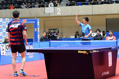 勝敗を大きく左右する3番ダブルス、初戦はシチズン時計ペアがリコーペアを下しているが、決勝では2番の山本がつくった流れに乗った鹿屋/有延が奮起。チキータからの両ハンドドライブを炸裂させて町/上村との打撃戦を制し、王手をかけた。