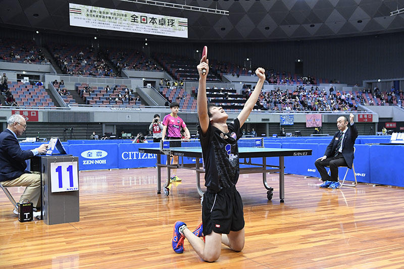 丸善インテックアリーナ大阪(大阪市中央体育館)で開催されている平成30年度全日本選手権大会。4日目はジュニア男子が決勝まで行われ、戸上隼輔(野田学園高)が優勝をつかんだ。