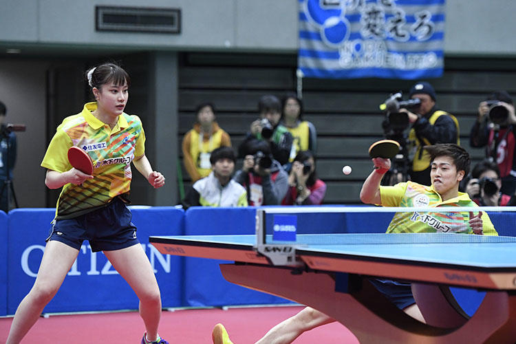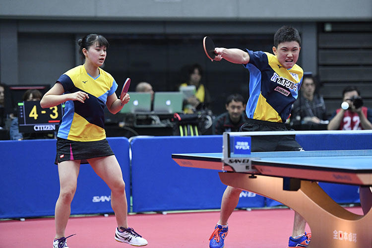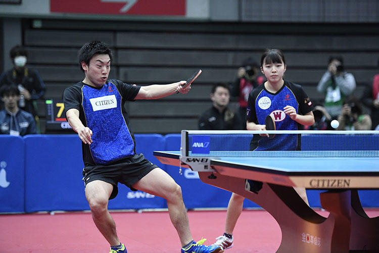 丸善インテックアリーナ大阪(大阪市中央体育館)で開催されている平成30年度全日本選手権大会。4日目は混合ダブルスが決勝まで行われ、森薗政崇/伊藤美誠(岡山リベッツ/スターツSC)が二連覇を果たした。