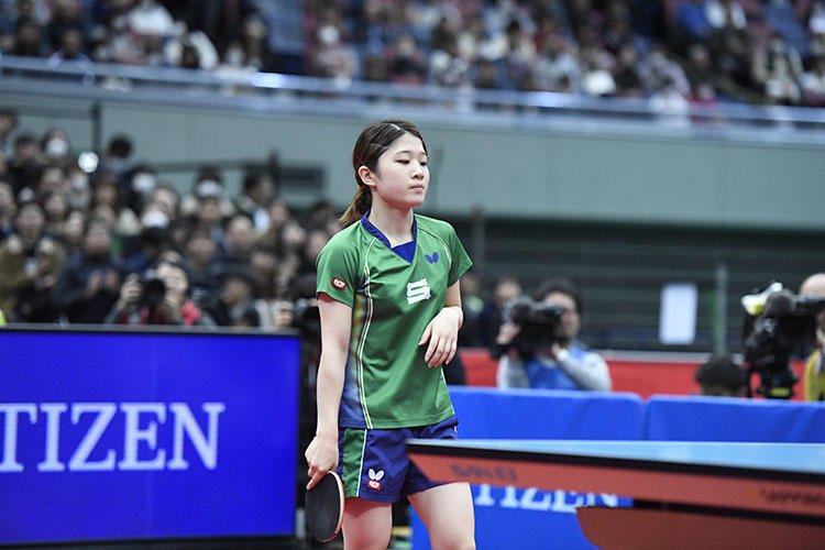 昨日、石川(全農)を打ち砕いた早田の驚異の攻撃力は今日も健在だった。はじくこするが自在のバックハンドに加え、男子ばりのフォアハンドドライブで芝田を圧倒。芝田もボールの威力では早田にひけを取らないはずだが、早田のオーラに気圧されたかのように凡ミスを連発。結果、最後まで攻撃の手を緩めなかった早田が芝田をストレートで下し、ベスト4へ進出した。
