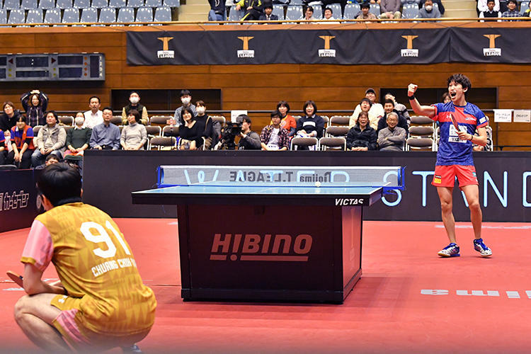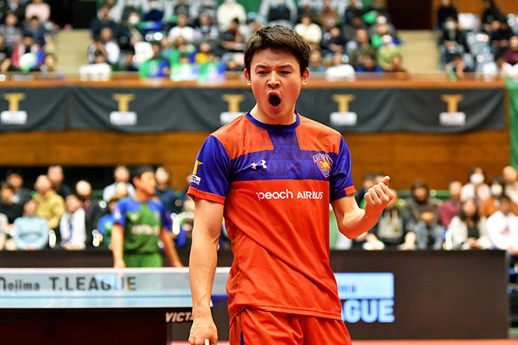 琉球アスティーダの有延大夢が張本智和に勝利 ©T.LEAGUE