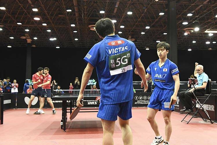 一方、前回銀メダルの森薗政崇/大島祐哉は、フランスのフロール/ルベッソンにゲームオール9本でよもやの敗戦。連続メダルのプレッシャーからか、いつものアグレッシブな連続攻撃が散発的で、フランスペアに足をすくわれてしまった。