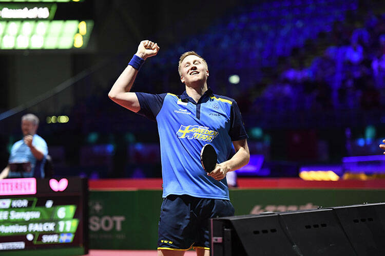 ファルク(スウェーデン)対李尚洙(韓国)は、ファルクに軍配。前回3位の李尚洙は、ファルクの精度の高いバックハンドと時折混ぜられる表ソフトラバーでのフォアハンドのコントラストに最後までペースをつかめなかった。