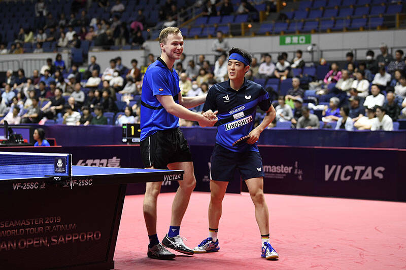 ドゥダ/D.チウ(ドイツ)対陳建安/荘智淵はドイツペアが勝利。ストレートへのバックハンドを起点にフォアハンドでしっかり動き、世界卓球2013パリ男子ダブルス王者の陳建安/荘智淵に堂々と打ち勝った。
