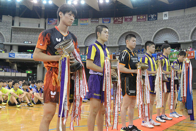 男子は学校対抗は愛工大名電、シングルスは戸上隼輔が優勝杯を返還