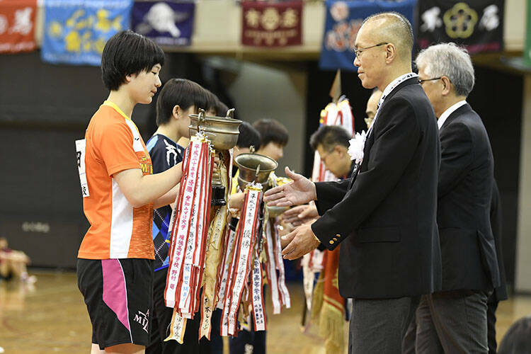 女子は学校対抗は四天王寺、シングルスは野村萌(中田絵梨奈が代理)が優勝杯を返還