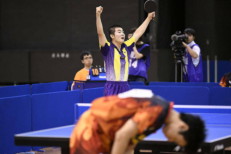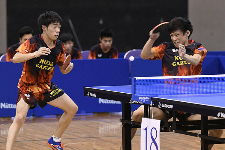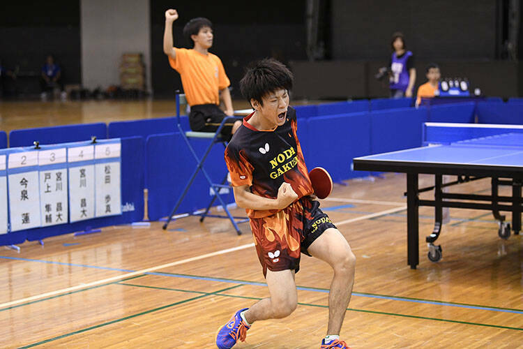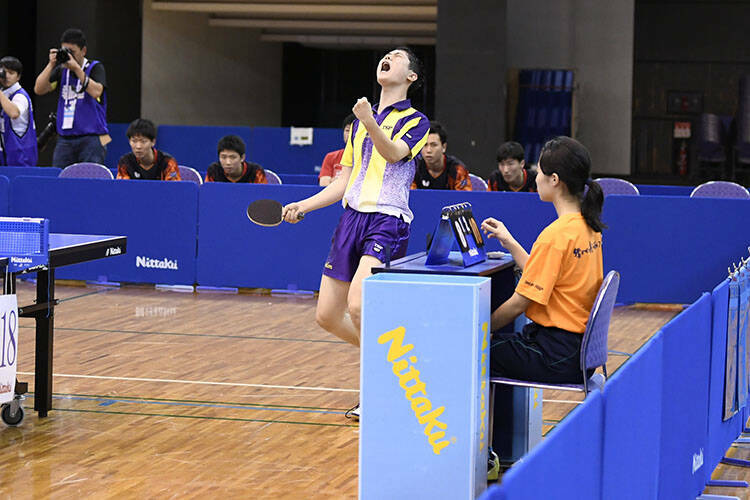 もう1点も落とせない野田学園は、戸上/宮川のチャンピオンペアが無理に攻めずに丁寧な台上から先手を取って第1ゲームを先取。しかし、決勝のために準備してきたという曽根/篠塚も、篠塚の柔らかいプレーと曽根の強打が噛み合うと爆発力がある。1ゲームずつ取り合ってむかえた最終ゲーム、野田学園ペアが優勢にゲームを進めたが、やはり、0対2という厳しい流れからか、ここで勝ちたいという愛工大名電の強い思いに飲み込まれるような形で、愛工大名電ペアが最後まで自信を持ってプレー。ゲームオール11-9という熱戦の末に、曽根と篠塚が両手を天に突き上げ、愛工大名電の勝利を宣言した。