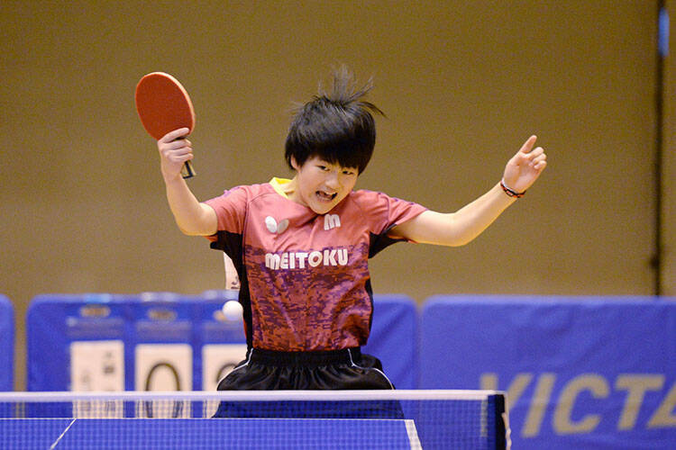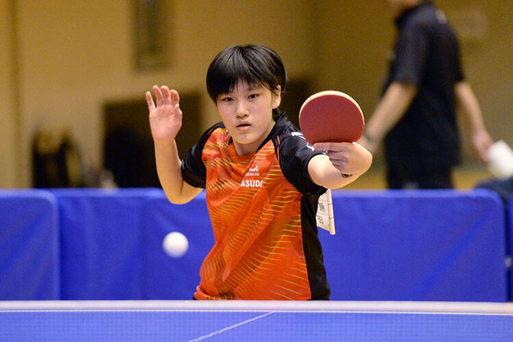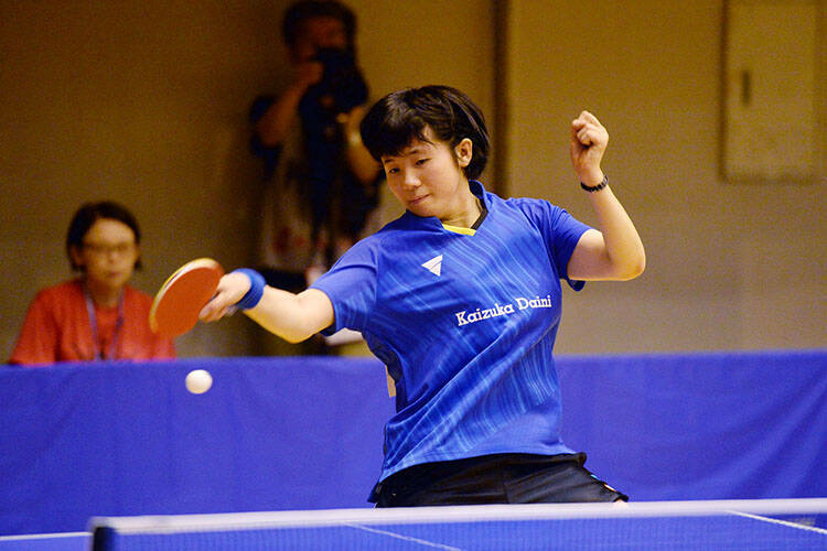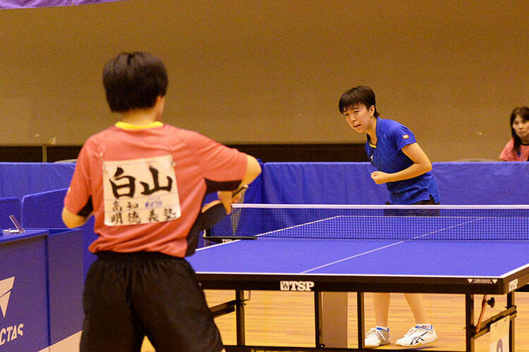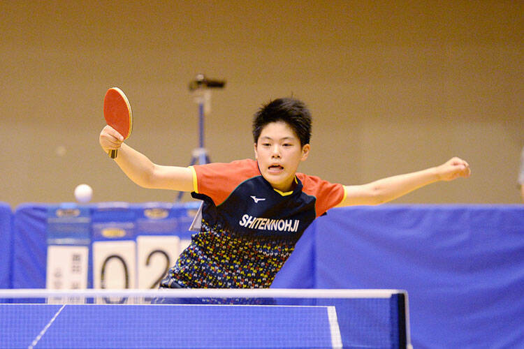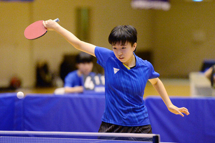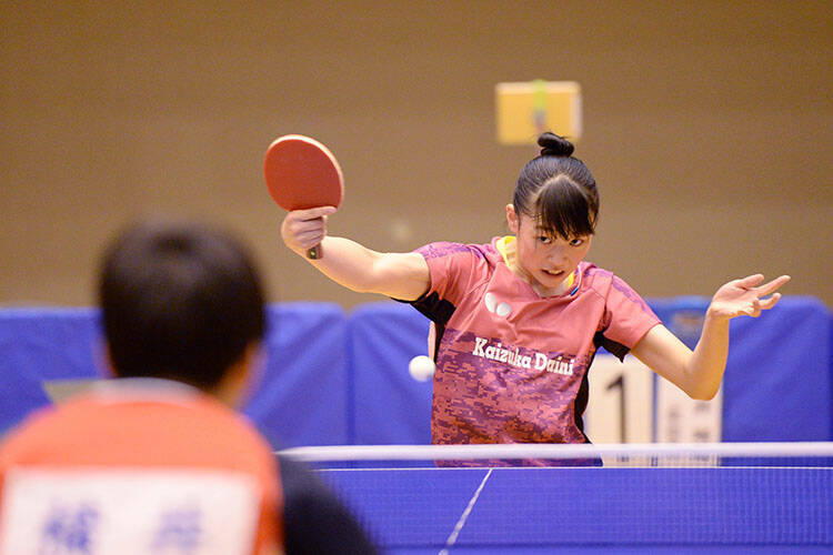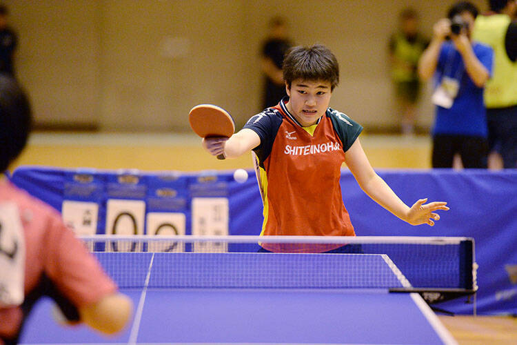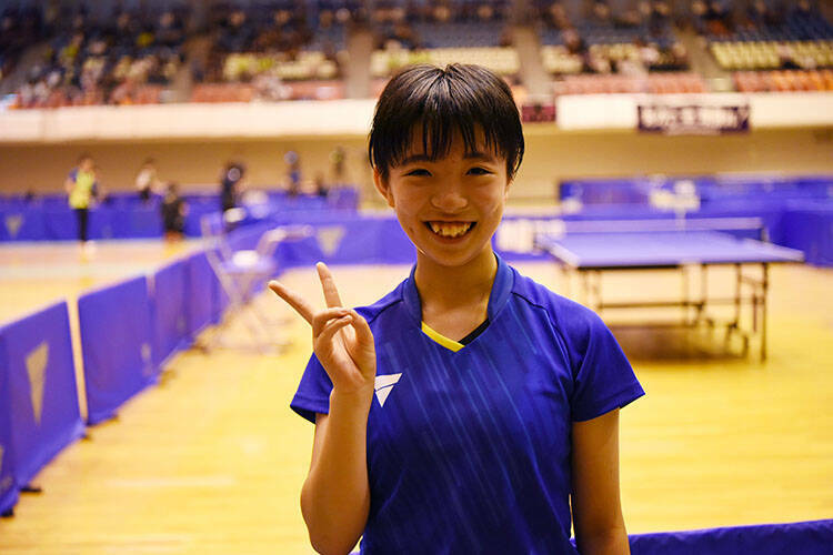 優勝はならなかったが、長いリーチが生かせるよう、ほかの女子選手よりもやや遠目に台から距離を取り、威力のあるドライブやフラット系のボールを駆使して優勝候補の大藤を下した試合は見事だった。