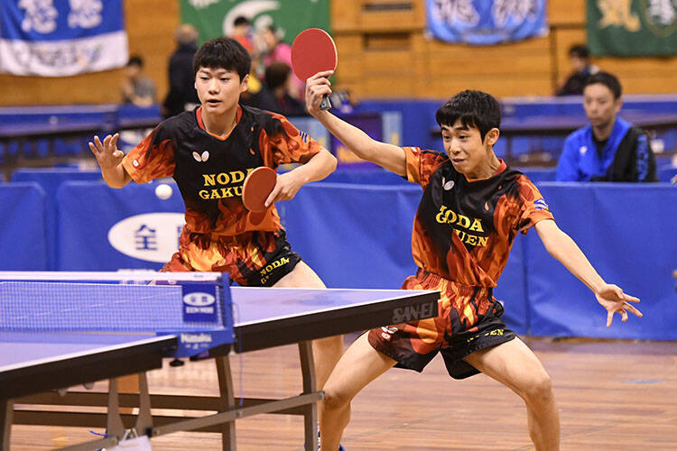 男子ダブルスを制したのは、中村/菅沼(愛工大名電中)。中村がスピード感あふれる速い攻めで切り込み、菅沼がダイナミックなスイングから放つ両ハンドドライブで続く連係で頂点に立った。