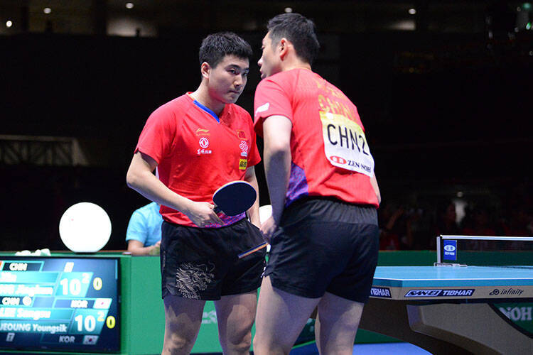 攻撃力で優る中国ペアが2対0とし、後がなくなった韓国ペアはフォア前のストップからの展開に弱い梁靖崑に的を絞り、中国ペアの得意な大きいラリーにせずに、台上の精度で勝負。競り合いをものにして2ゲーム連取すると、最終ゲームもストップレシーブを軸にした読み合いで優位に立ち、手を狭められた中国ペアに競り勝った。ダブルスに滅法強い許昕だが、ミスを重ねる梁靖崑のフォローに余力を失ったが、自身のプレーにも勝負どころでミスが出た。