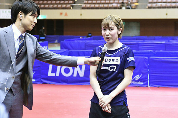 日本生命同士の対戦となった早田ひなとの決勝では、鋭いチキータを軸にした台上からの速い攻めで優位に立って早田の強打を封じ、優勝を決めた。