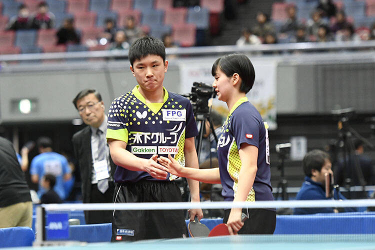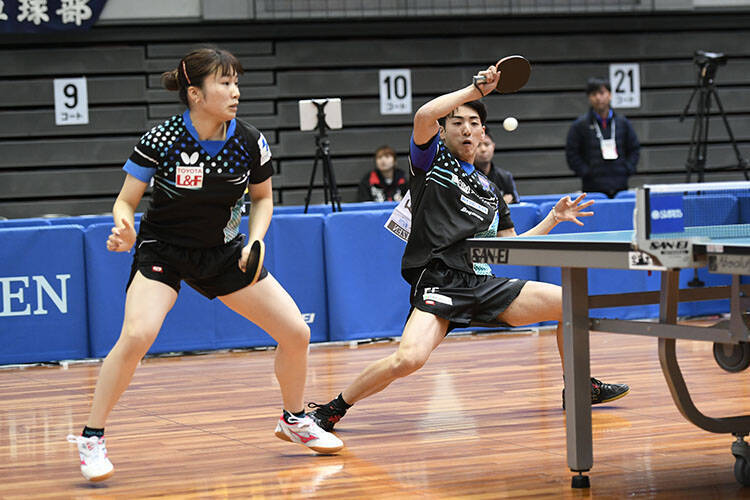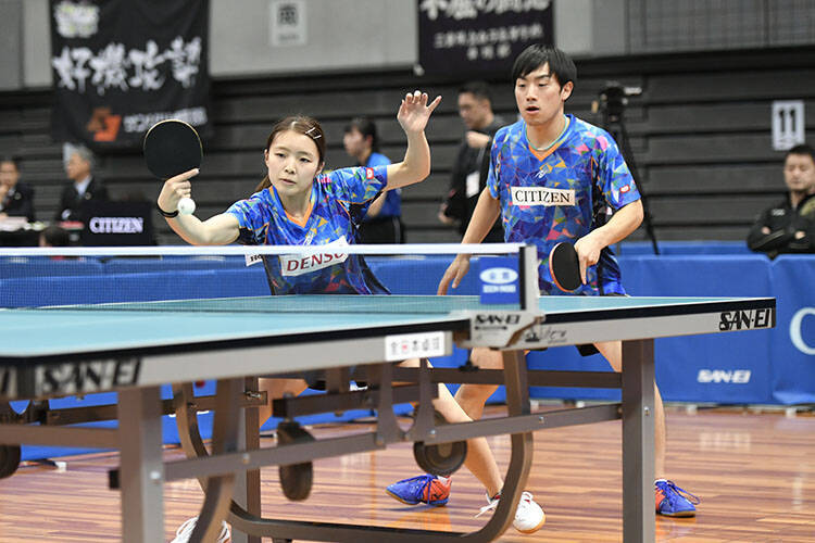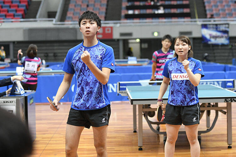 昨年3位の上村慶哉/阿部愛莉(シチズン時計・東京/デンソー)もベスト8に勝ち上がった。阿部の変化速攻と上村の高いラリー力のペアリングで初優勝を目指す。