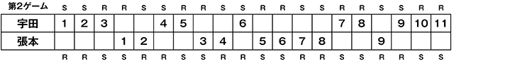 第2ゲーム 宇田幸矢 11−9 張本智和