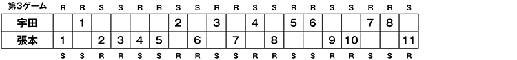 宇田 7-10 張本 張本が回り込み3球目をミスし、宇田が得点