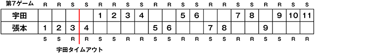 宇田 0-3 張本 宇田が回り込み3球目攻撃からの連打をミスし、張本が得点。宇田がタイムアウト