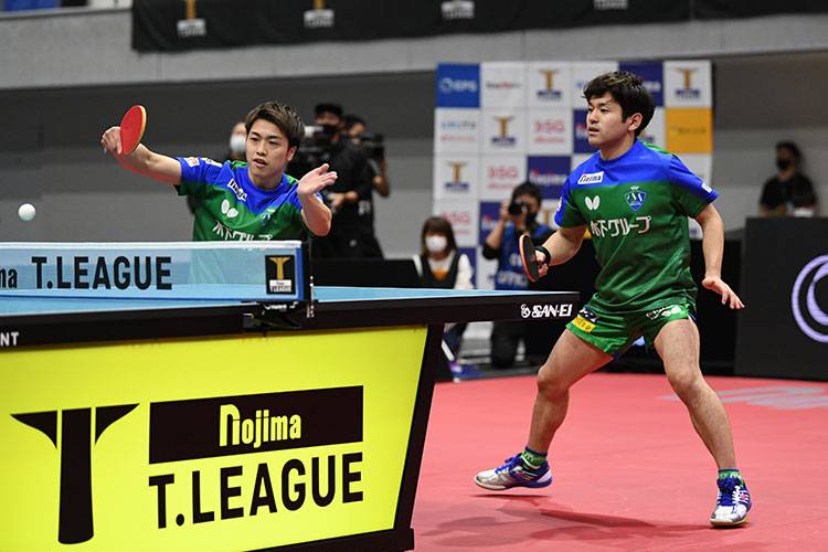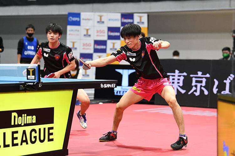 上り調子の二人が組む琉球ペアが飛び出すかに思われたが、木下ペアが老獪なプレーを見せた。ツッツキやループドライブを巧みに織り交ぜて琉球ペアの距離とタイミングを狂わせ、ストレートで快勝。 木下マイスター東京が先制した。