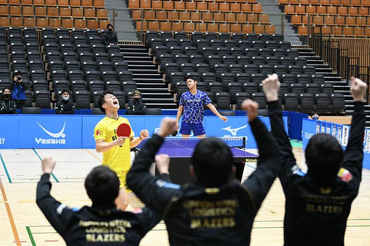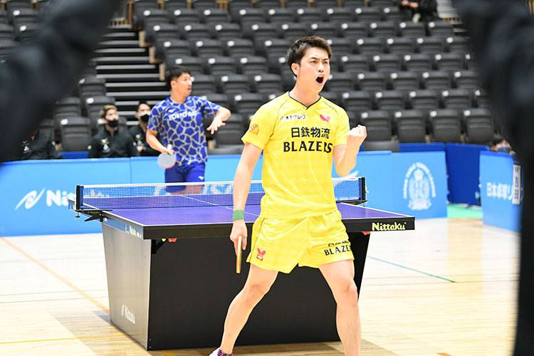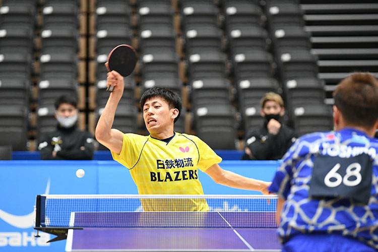 ラリーに強い両者の試合は打撃戦を続けながらフルゲームまでもつれるが、最後はボールの威力でわずかに勝った田添が高木和を振り切り、日鉄物流ブレイザーズが先制する。