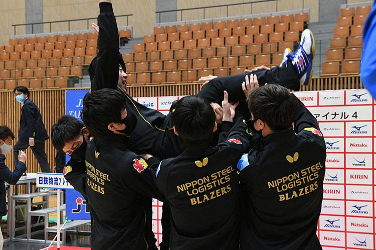 吉村特有の気配なき鋭い両ハンドに動じない松下は、ブロックからの盛り返しやカウンターを決めてペースを握る。一方の吉村は、松下の勢いに気圧されたのか、常になく凡ミスが多いプレーでなかなか波に乗れない。結局、松下が勢いに乗って攻め、吉村が受ける構図は最後まで変わらず、松下が3対1で勝利。日鉄物流ブレイザーズが悲願のファイナル4初優勝を驚きのストレート勝ちで決めると、杉井監督が選手たちによる勝利の胴上げで宙を舞った。