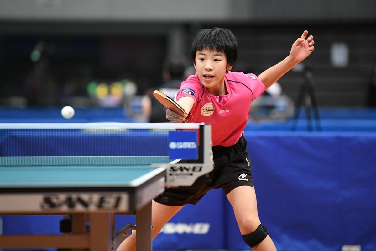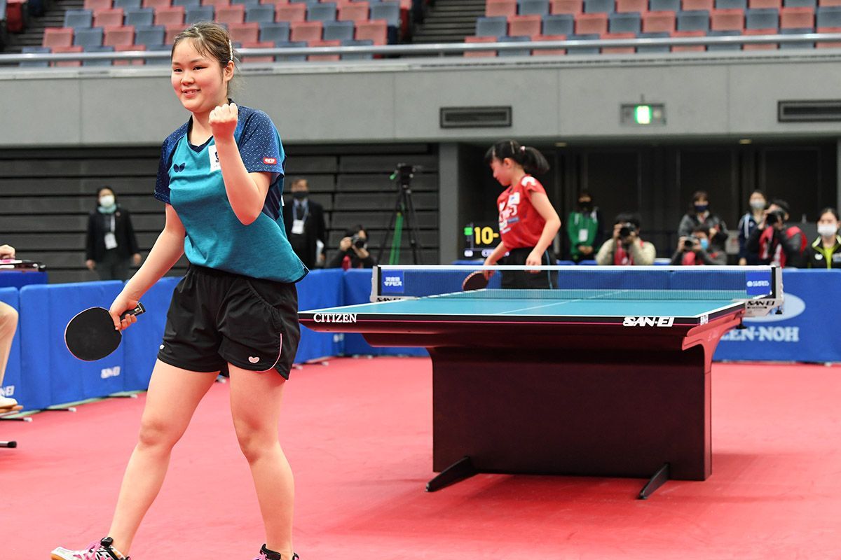 後輩の由本楓羽(貝塚第二中)との打撃戦を制し、ジュニア女子でベスト8入りを決めた赤江夏星(香ヶ丘リベルテ高)は攻め続ける両ハンドドライブで1回戦で藤尾真結(日本体育大)、2回戦で大島奈々(専修大)と大学生を連破。この快進撃がどこまで続くか楽しみだ。