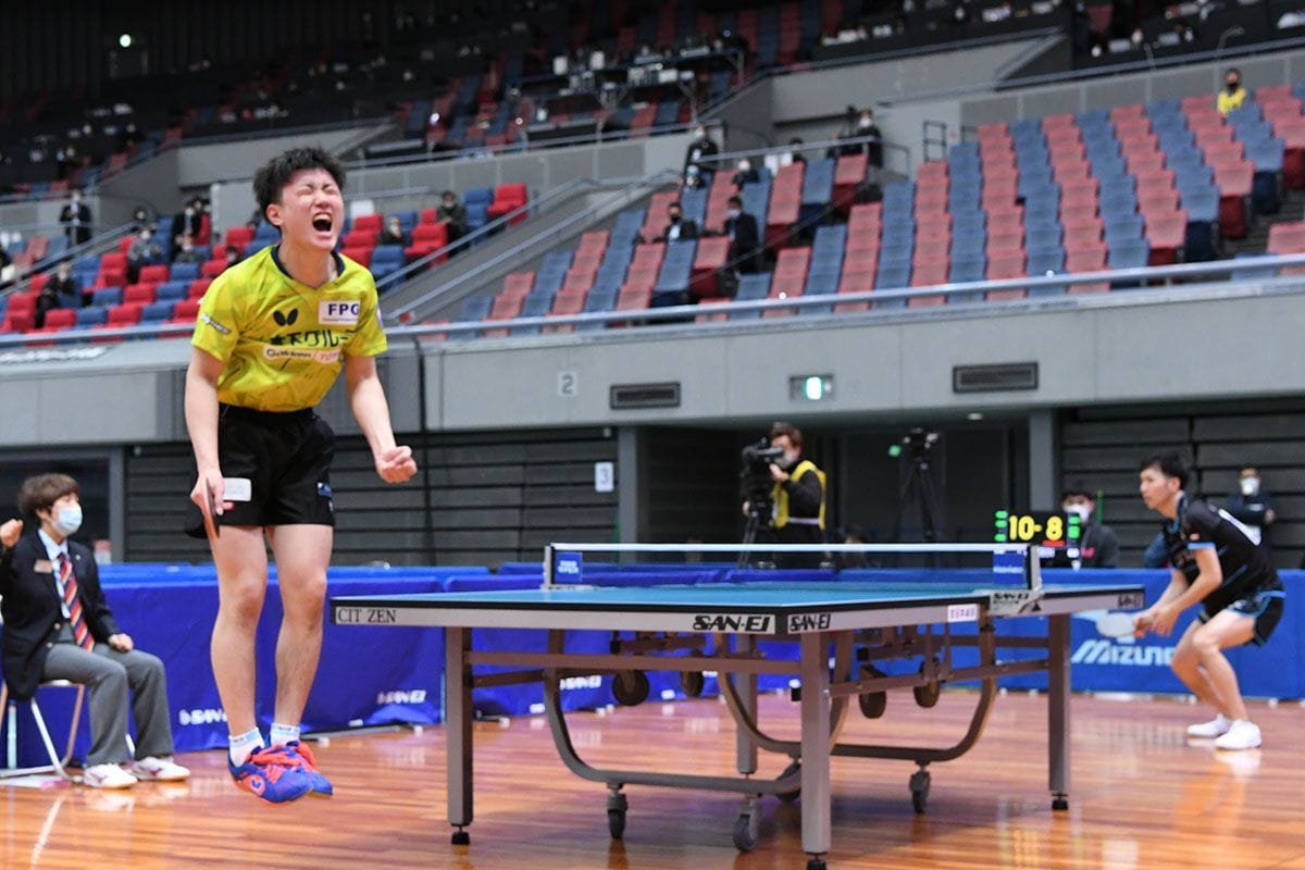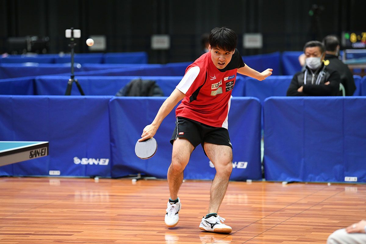 2年振り二度目の優勝を目指す張本智和(木下グループ)は、6回戦でカット主戦型の御内健太郎(シチズン時計)に大苦戦。御内の守備範囲の広いカットと時折繰り出してくる威力のある攻撃に押され、一時は御内にマッチポイントを許してしまう。しかし、そこから「カット打ちは肩がつらいんですけど、最後は肩を壊してもいいと思うくらい振り切りました」と振り返るように迷いのないスイングで御内のカットを打ち抜き、逆転で勝利をもぎ取った。