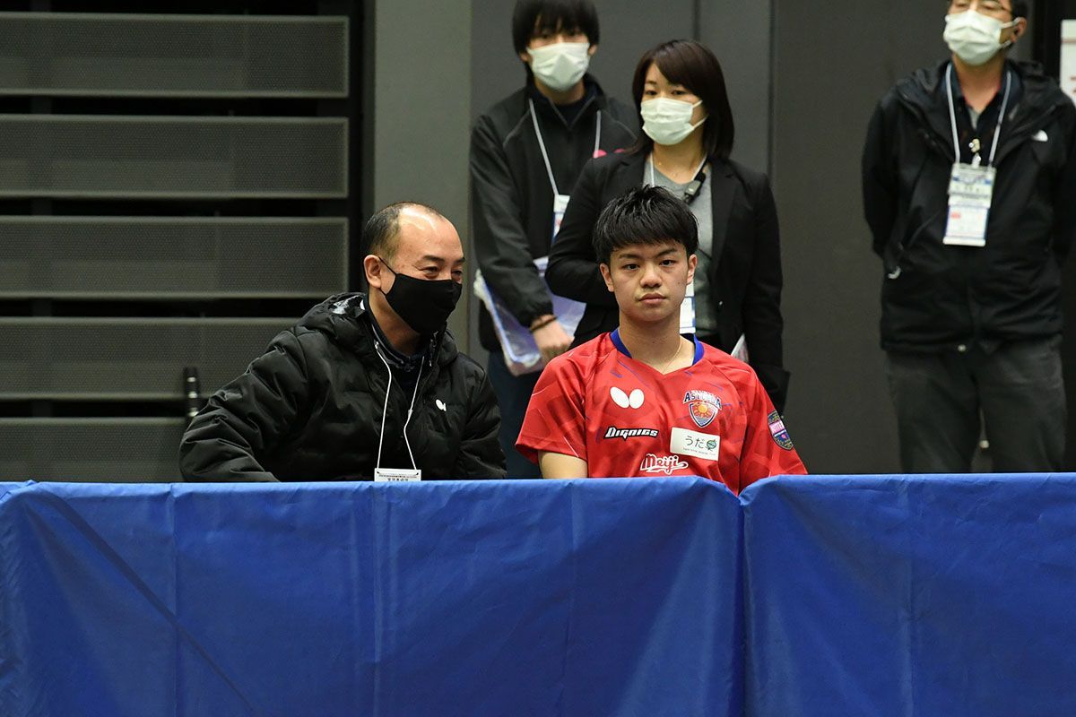 第1シードの宇田幸矢(明治大)は初陣となる4回戦で、ジュニア男子でベスト16に入った鈴木笙(静岡学園高)と対戦。出足こそ快調な滑り出しで第1ゲームを先制するが、第2、第3ゲームを鈴木に奪われると、プレッシャーに手足をからめとられていった。得意のチキータから始めたい宇田だったが、鈴木の逆横回転系サービスにタイミングや位置取りをうまく外され、ペースが握れない。一方の鈴木は、勝ち急がず丁寧なプレーで宇田のミスを誘う。結果、宇田は終始ペースを握れないまま、ゲームオール7本で力尽きた。