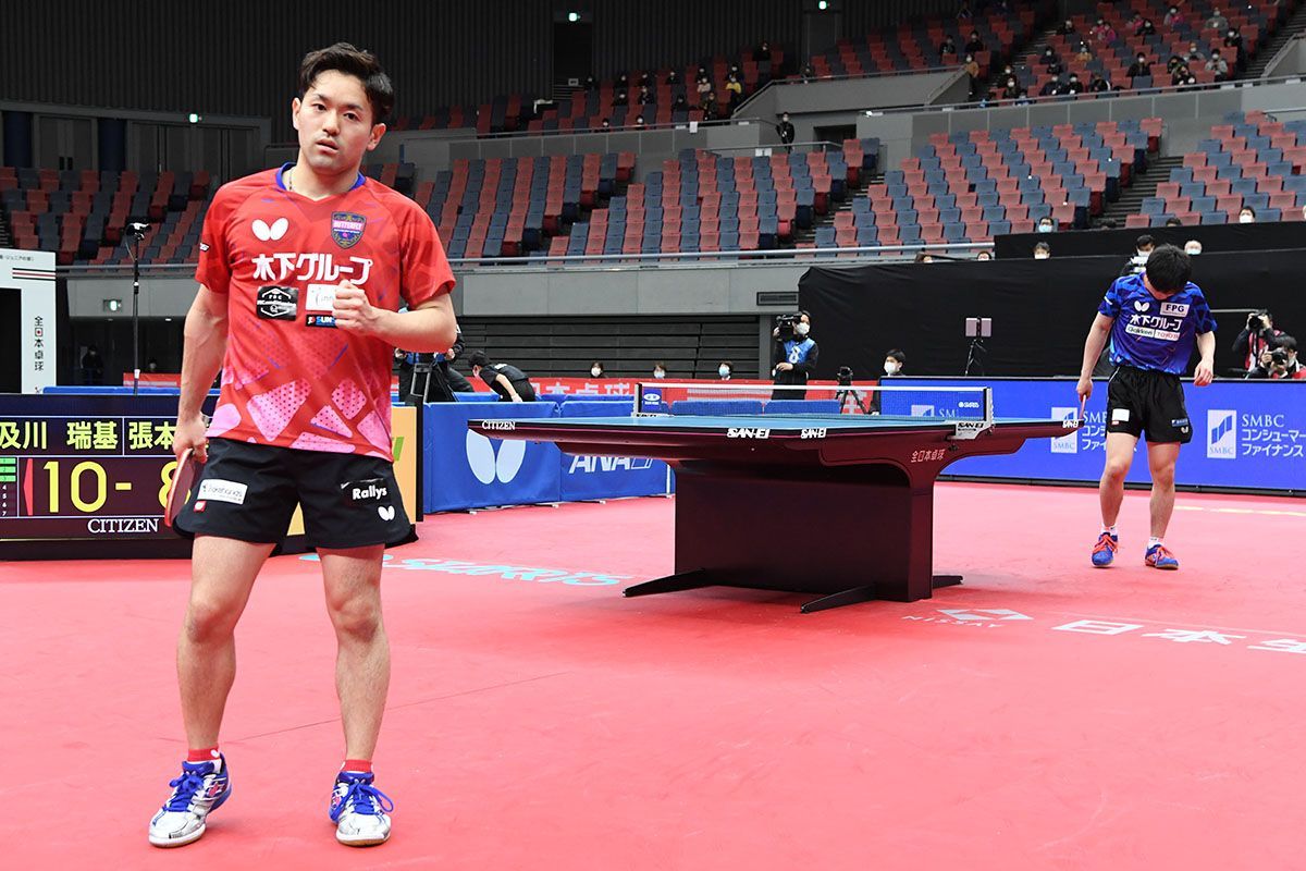 優勝の最有力候補と見られていた張本智和(木下グループ)は、Tリーグ・木下マイスター東京のチームメイト、及川瑞基に敗れた。昨日行われた6回戦で御内健太郎(シチズン時計)に逆転勝利を挙げ、さすがの集中力を見せた張本だったが、「昨日(御内戦)の疲れが残っていた」と語るように疲労からかプレーにいつもの精彩を欠き、足を使ってぐいぐい押してくる及川に押し切られた。