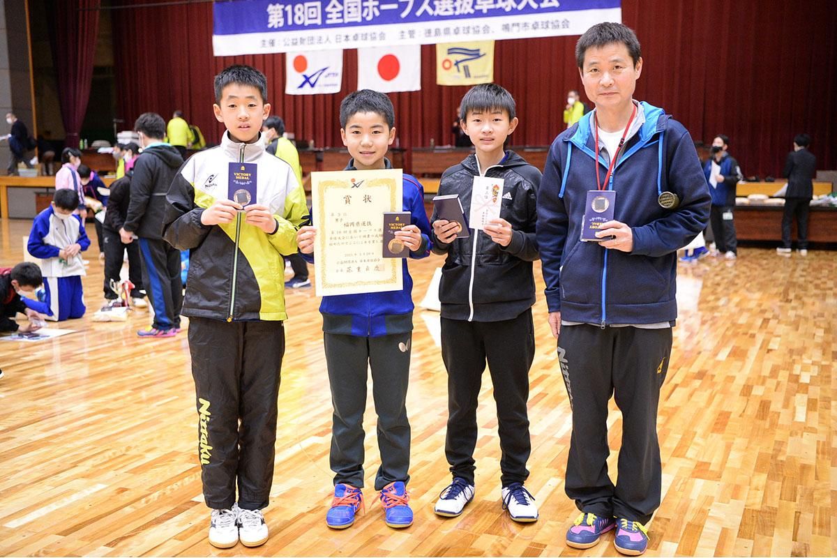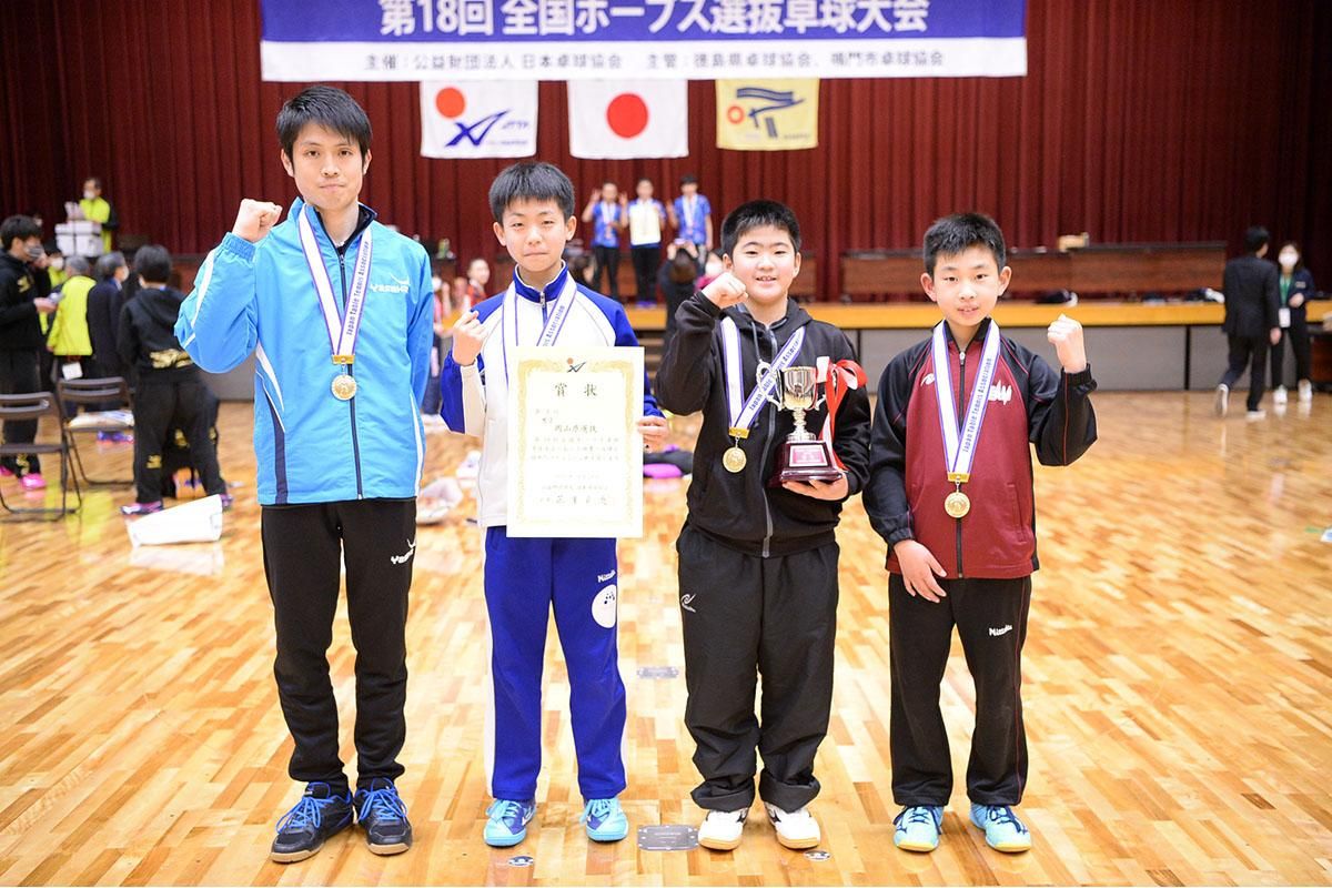 岡山県選抜は、大西瑛心と上田晃大の6年生コンビが、並み居る強敵たちを向こうに回して全勝と大ブレイク。サウスポーの大西は見惚れるような球さばきで先制点をたたき出し、上田が回転量の多いバックハンドドライブからの丁寧なプレーで締めるパターンで、岡山県の先輩たちが築いてきた栄冠に続いた。