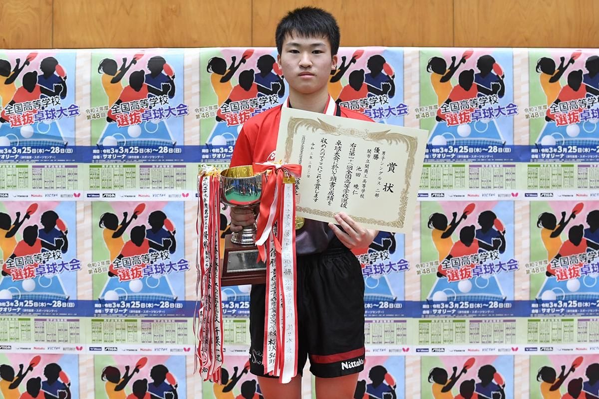 男子シングルス優勝の池田暁仁(関商工)は、決勝でカット主戦型の本坊の変化を読み、得意のフォアハンドドライブで接戦を制した。