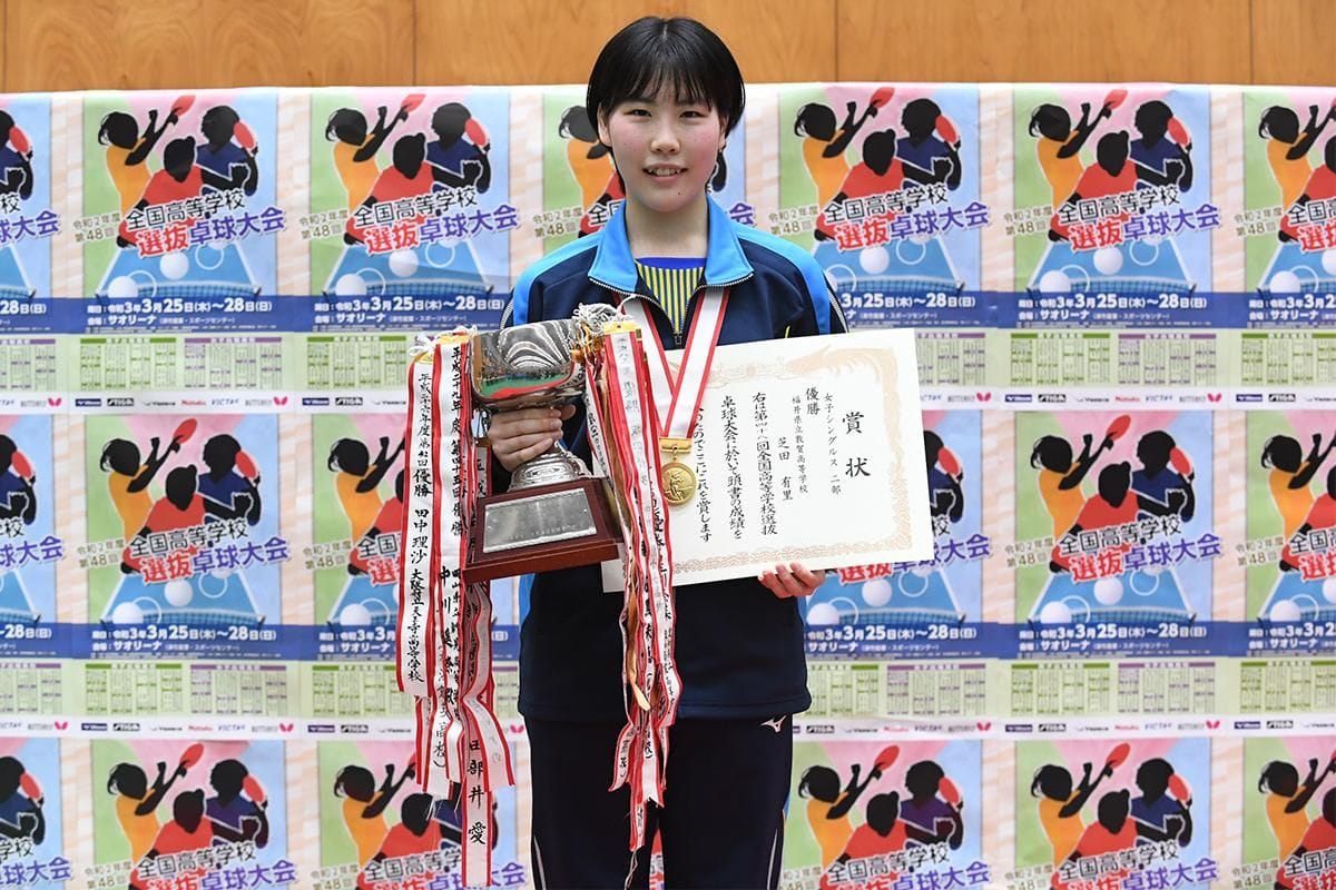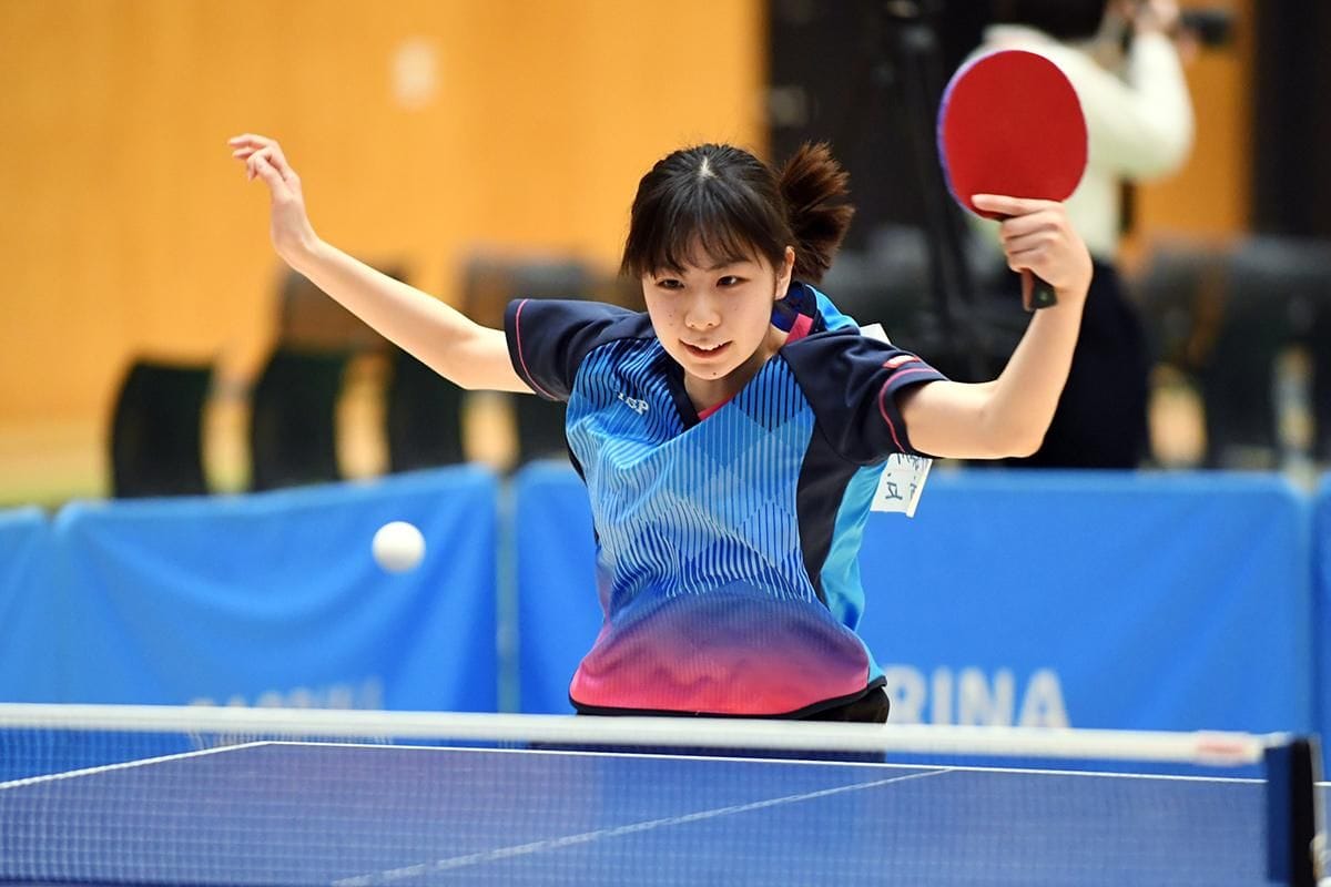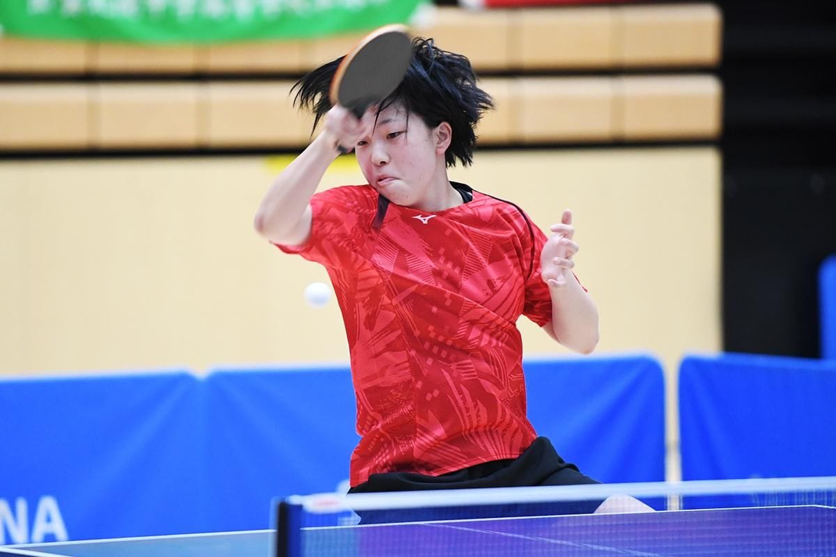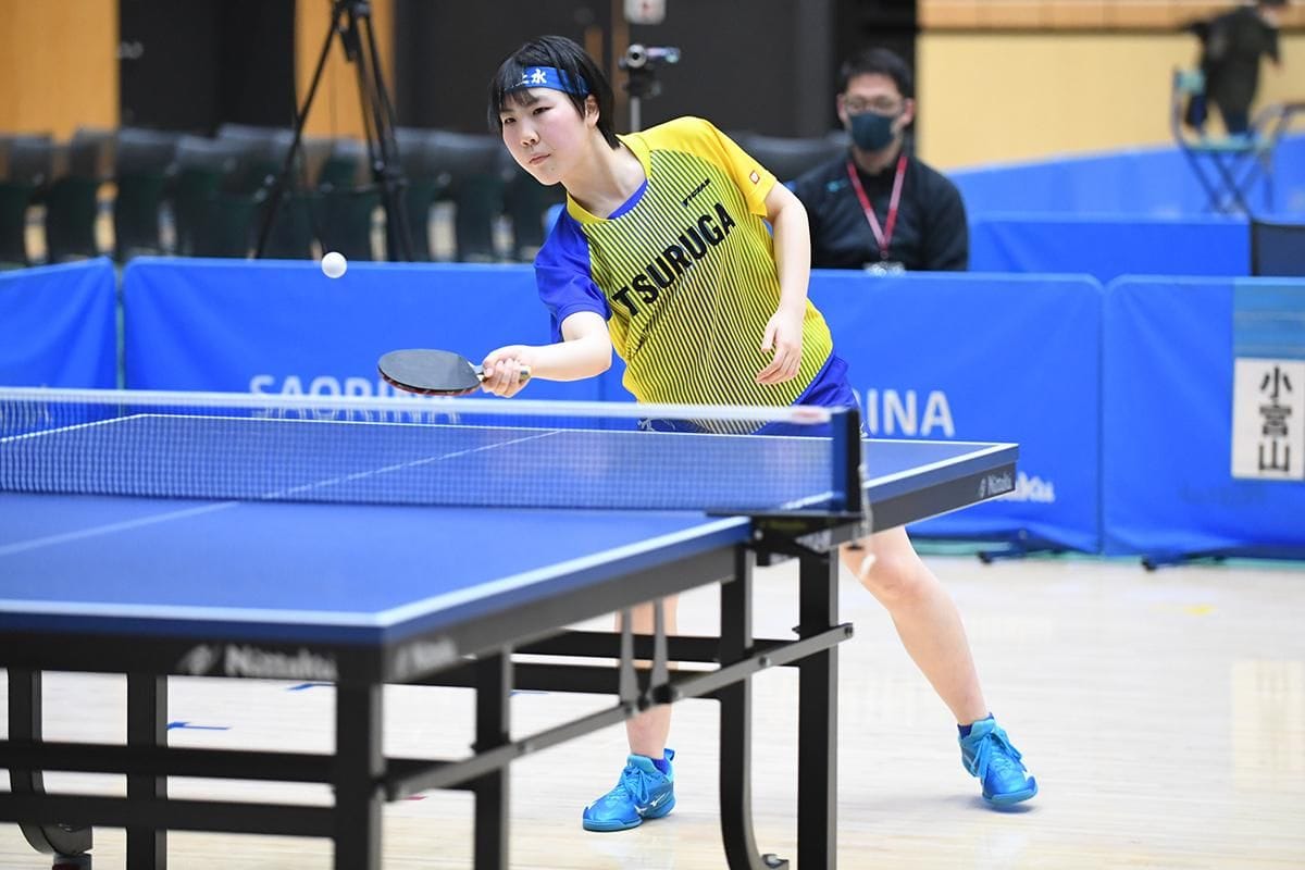 女子シングルス優勝の芝田有里(敦賀)はバック面に表ソフトラバーを貼るカット主戦型。一番の山場だったという決勝も落ち着いた守備からチャンスを見いだして安定感のあるプレーを見せた。