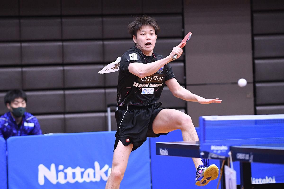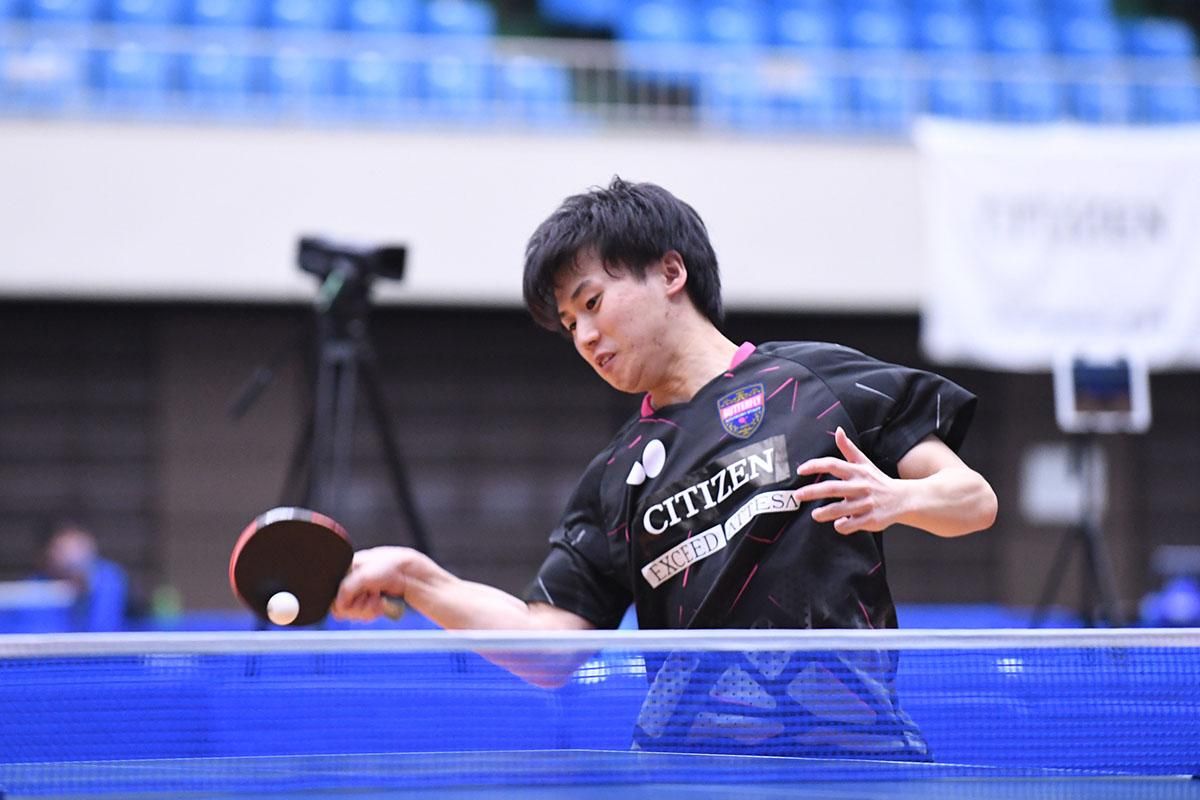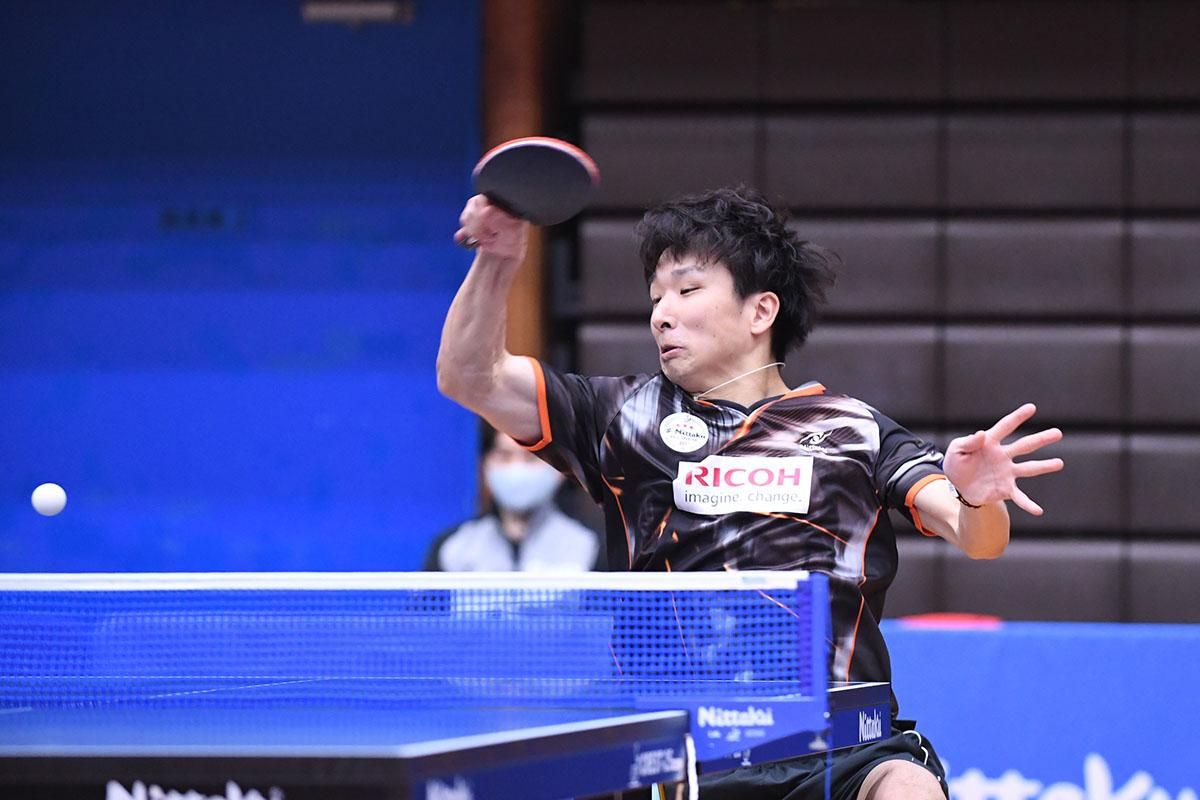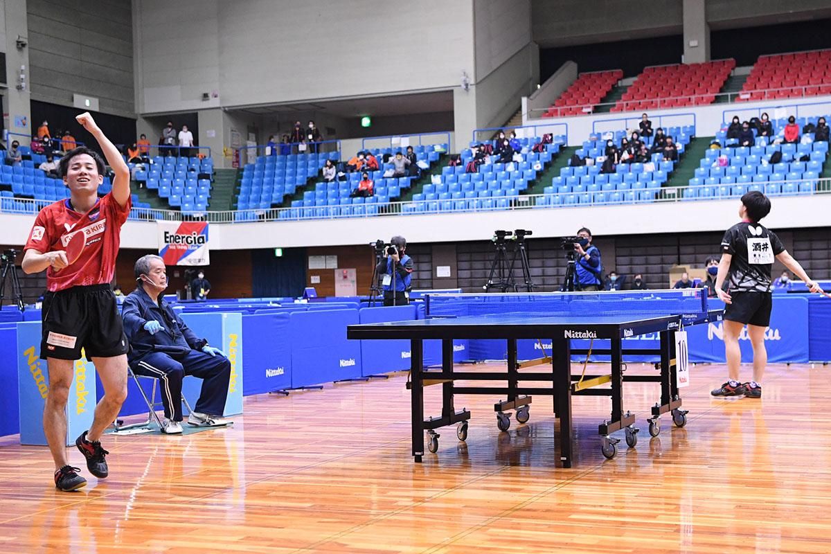 2位の酒井明日翔(シチズン時計)は、強烈なチキータと目の覚めるようなカウンターで、準々決勝で鹿屋良平(リコー)との強打者対決を制すと、準決勝ではラリー巧者の藤村友也(日鉄物流ブレイザーズ)に競り勝ち、決勝まで勝ち上がった。