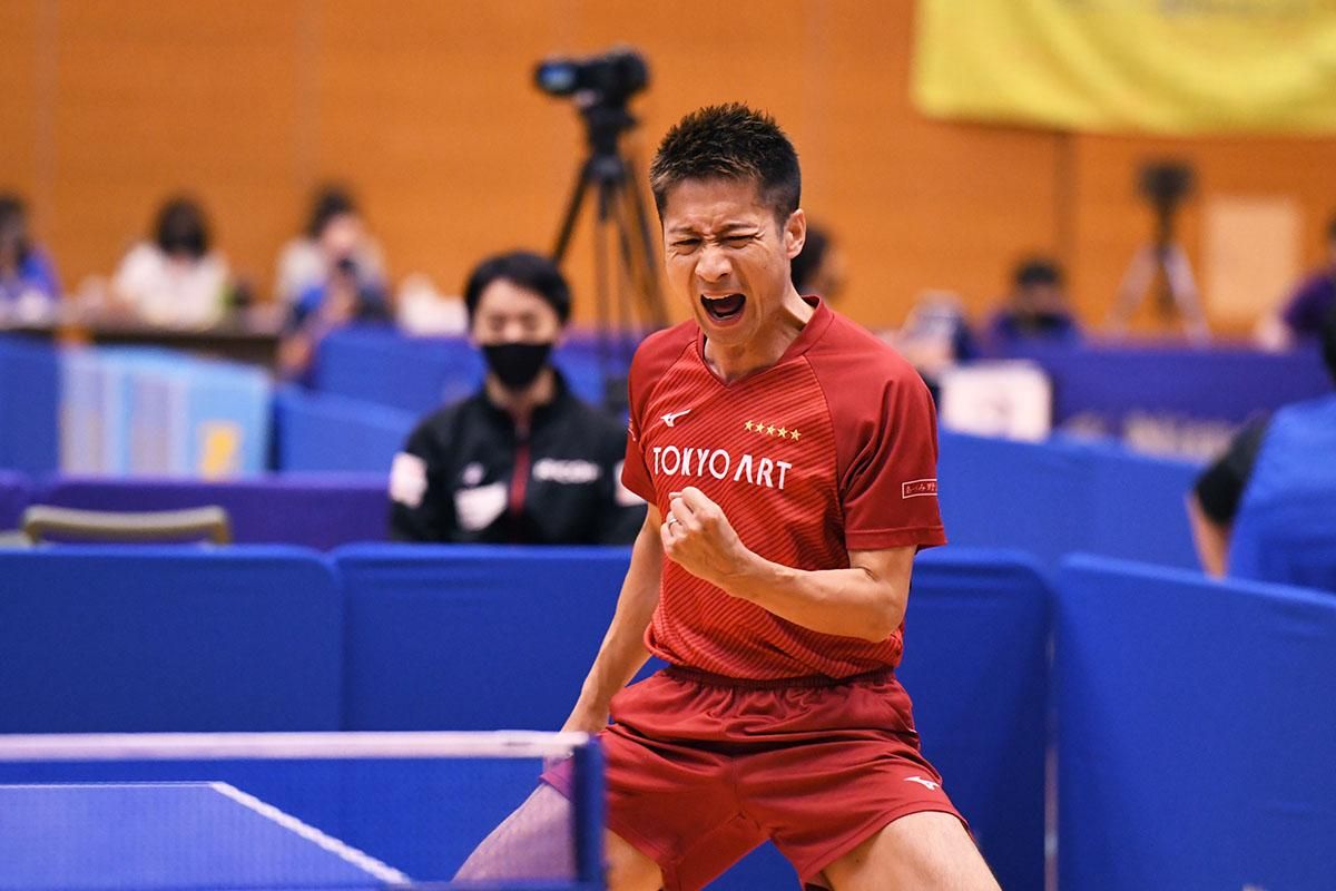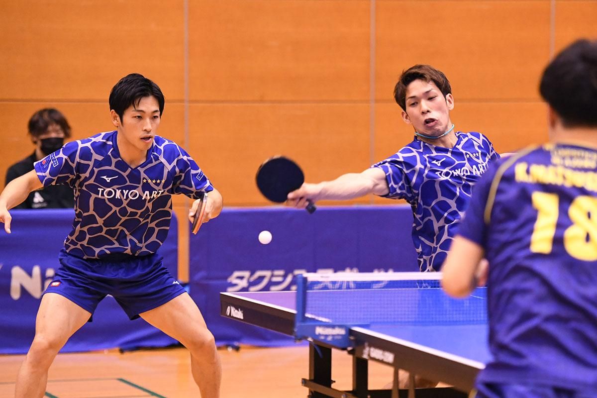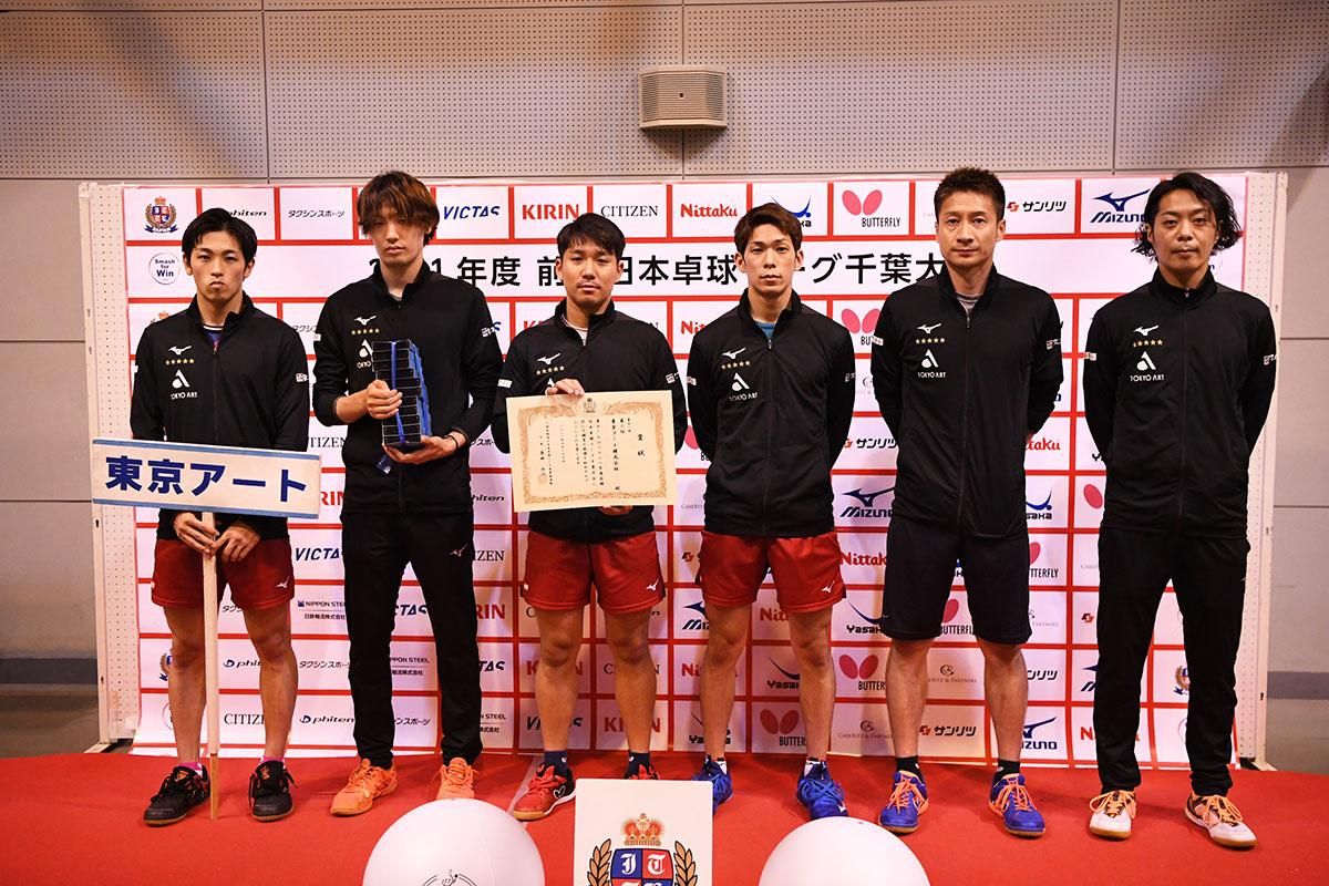 2位に入ったのは東京アート。今期からエース格の吉村和弘(岡山リベッツ)が抜け、戦力ダウンが懸念されたが、アジア選手権大会男子選考合宿で3位に入り、日本代表の座に返り咲いた村松雄斗、ベテランの小西海偉、ニューダブルスの上江洲光志/坪井勇磨が奮戦し、常勝軍団としての面目を保った。
