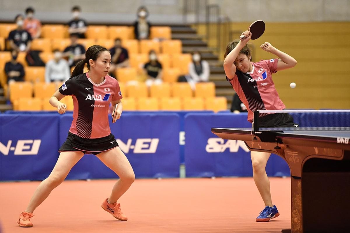 トップのダブルスは、石川/平野対宋恵佳/長﨑美柚(中国電力/日本生命)。日本リーグで活躍する中国式ペンドライブ型の宋はドイツのペン表ソフト速攻型・シャン・シャオナ、2019年世界ジュニア選手権タイ大会女子シングルス優勝の長﨑は、P.ゾルヤの想定だ。