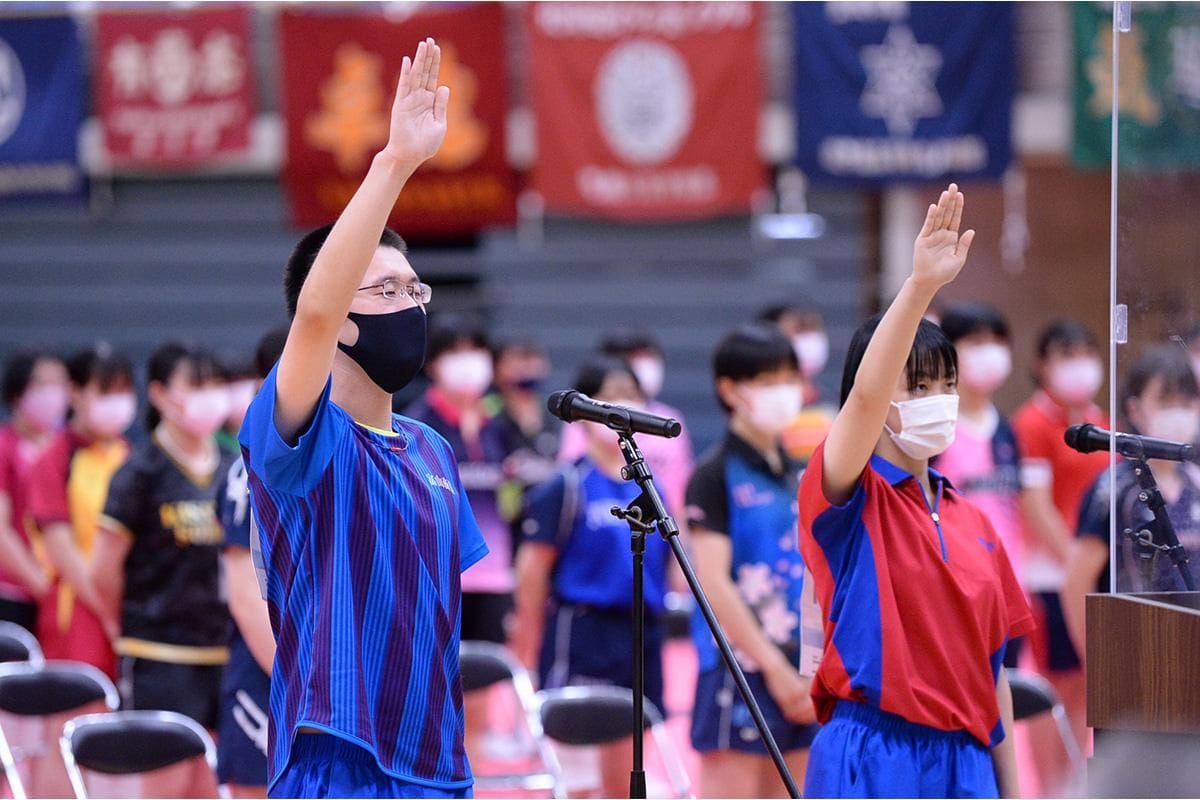 選手宣誓では、富山商業の赤尾晟大朗、高岡龍谷の細川菜結が選手を代表して、コロナ禍での開催に尽力された方々と日頃サポートしていただいた方々への感謝、全国からみながこうして集まることができた喜び、そして、今卓球ができる喜びを高らかに述べた。