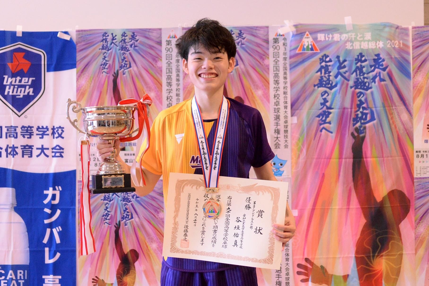 谷垣は、「他の選手と違う軌道のボールを打っている。発想が自由で、両ハンドともどこからでもどこへでも打つ」と愛工大名電の今枝監督が評する両ハンドドライブで吉山をぐいぐい攻め立て、ゲームカウント3対1で勝利。谷垣は男子学校対抗、篠塚と組んだ男子ダブルスに続いてシングルスのタイトルも獲得し、平成27年に愛工大名電OBの木造勇人(愛知工業大)が達成して以来となる三冠王に輝いた。