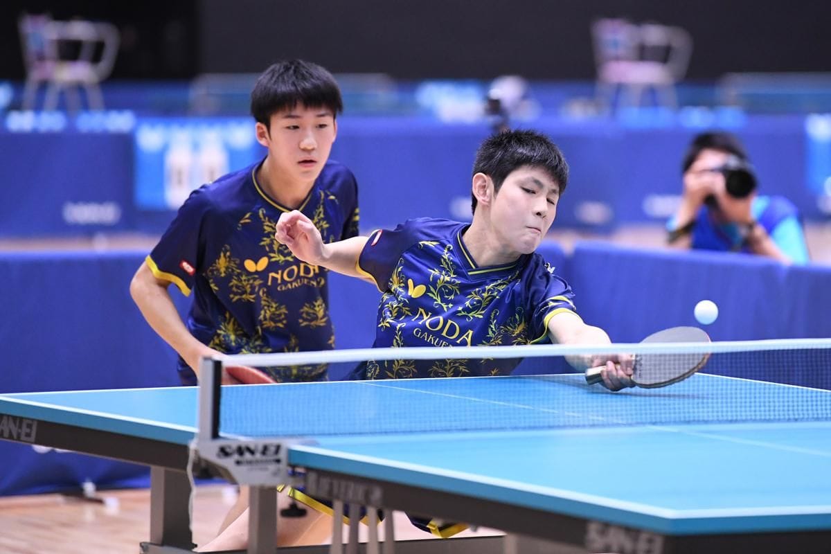1番の菅沼は柔らかいバックハンドで、フラットなボールを多用するホープス3位の実力者、岡本のミスを誘いストレート勝ち。2台進行で同時に行われた2番の吉山も、前半でのポイントゲッターとしての役割を決勝でも全うしてストレート勝ち。優勝候補筆頭の愛工大名電が王手とあって、野田学園のここからの逆転は厳しいかに思われたが、続くダブルスで、丸川/大坪のサービス・レシーブから先手を取るプレーで名電ペアに快勝し、後半に望みをつないだ。