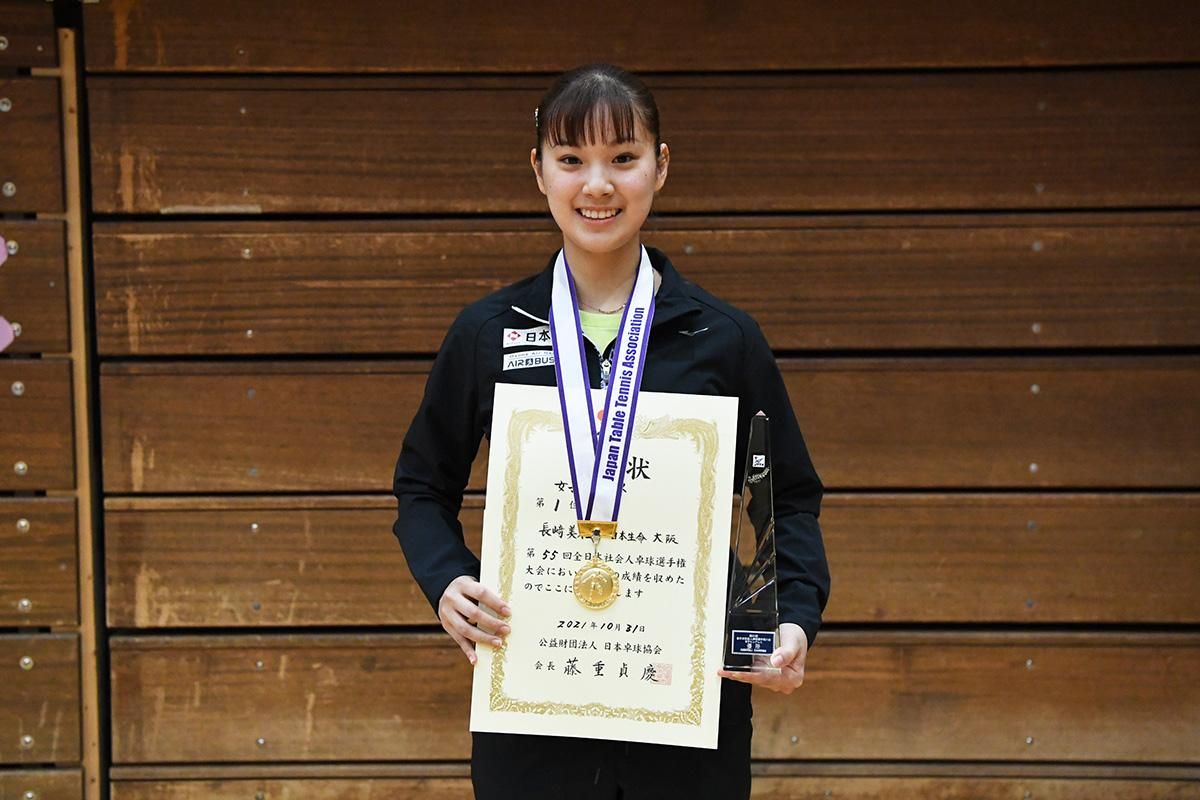 直近の2021世界卓球選手権ヒューストン大会男女日本代表選手選考合宿で敗れている橋本に対し、「負けて技術も体調も万全の準備をして、自分を信じて戦った」という長﨑は、強烈かつミスの少ないカット打ちで橋本に反撃の糸口を与えずストレートで快勝し、社会人ルーキーイヤーで初優勝を飾った。