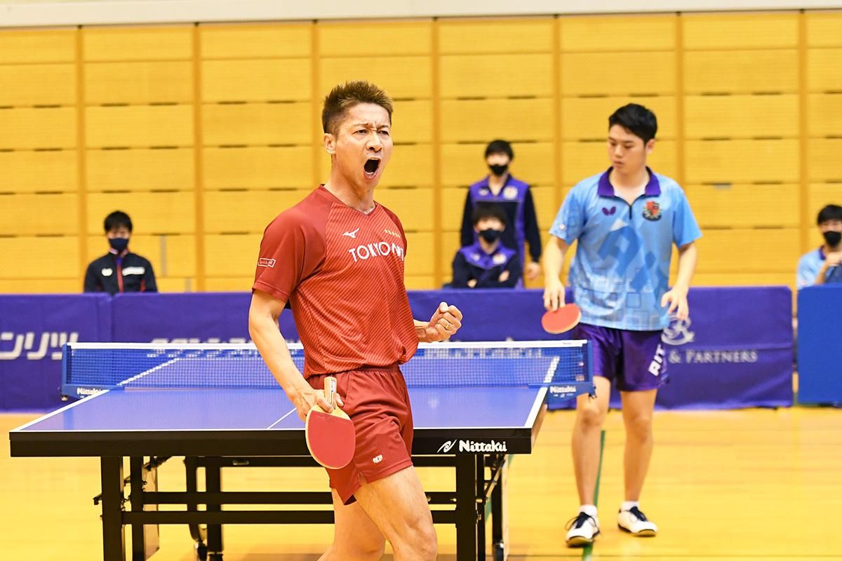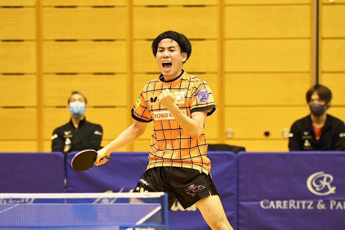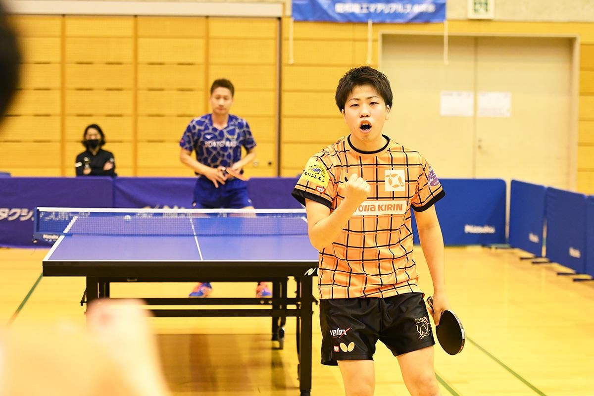 全勝とはいえ、優勝までの道のりは苦しかった。初戦のクローバー歯科カスピッズ、日鉄物流ブレイザーズ、協和キリンとの試合はいずれも2対2のラストまでもつれる接戦になったが、どの試合も5番で坪井勇磨がことごとく踏ん張り、全勝を守った。特に「あの勝利が非常に大きかった」と大森監督が噛みしめたように、日鉄物流ブレイザーズ戦で実力者の藤村に対し、終始積極的なプレーで勝利した坪井のプレーは見事だった。