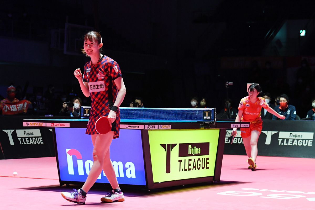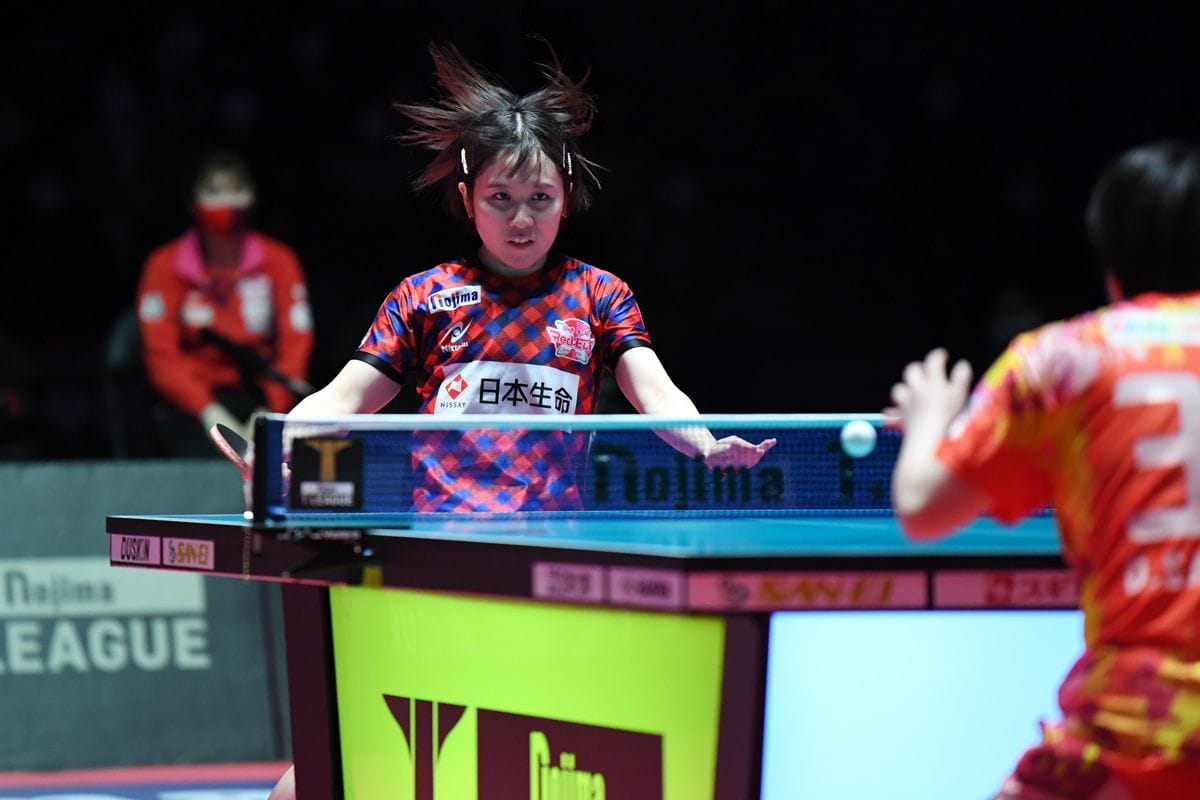 1番のダブルスからゲームオールにもつれる白熱した展開になったが、日本生命ペアが長﨑のチキータから森が両ハンドで続く連係で馮天薇/大藤を振り切り、先制点を挙げる。