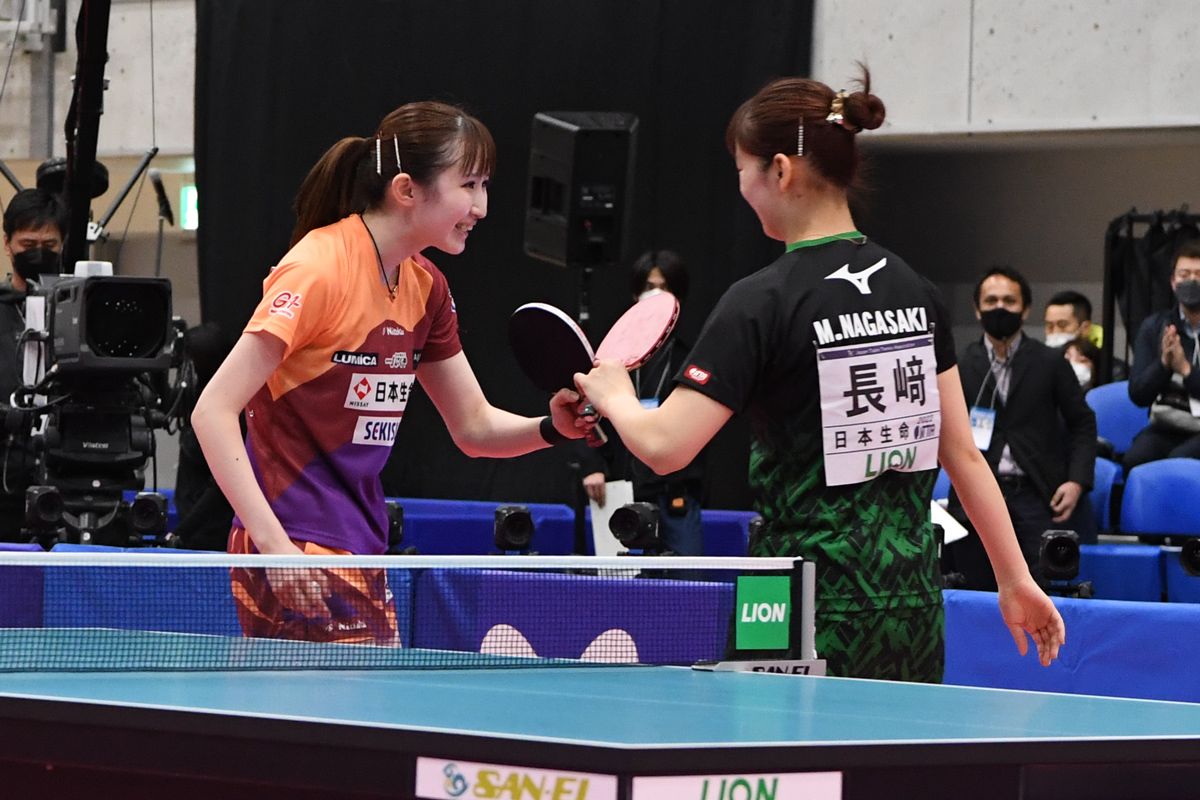 日本生命の先輩後輩で同じ練習場で一緒に切磋琢磨しながら練習をしているので、やっぱりだいたいの戦術だったりそういった部分はお互い知っていて、そして今回長﨑選手は伊藤選手(伊藤美誠/スターツ)に勝って非常に乗って上がってきていたので、0対3のときは特にチャレンジャーの気持ちで自分から攻めていくという気持ちで1本1本プレーして、それが勝利につながったと思います。