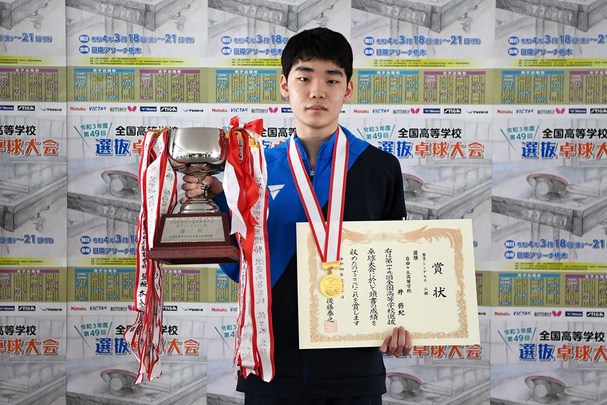 男子シングルスを制したのは井修紀。ちなみに、井の姉は中国電力で活躍する井絢乃選手。ラリー戦に強い川瀬との決勝戦はゲームオールにもつれる接戦になったが、姉譲りの伸びやかな両ハンドドライブで打ち勝ち、見事に頂点をつかみ取った。