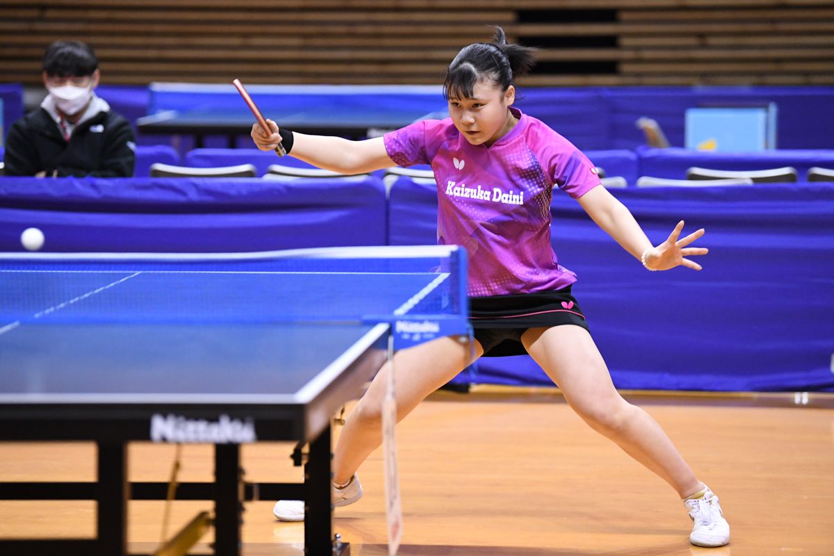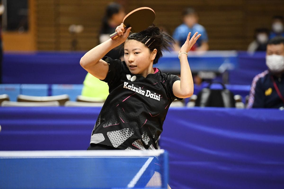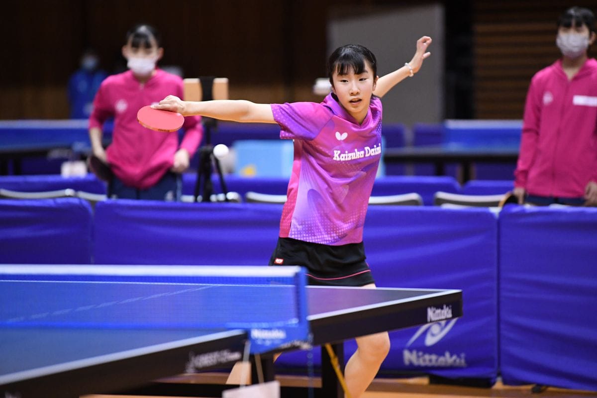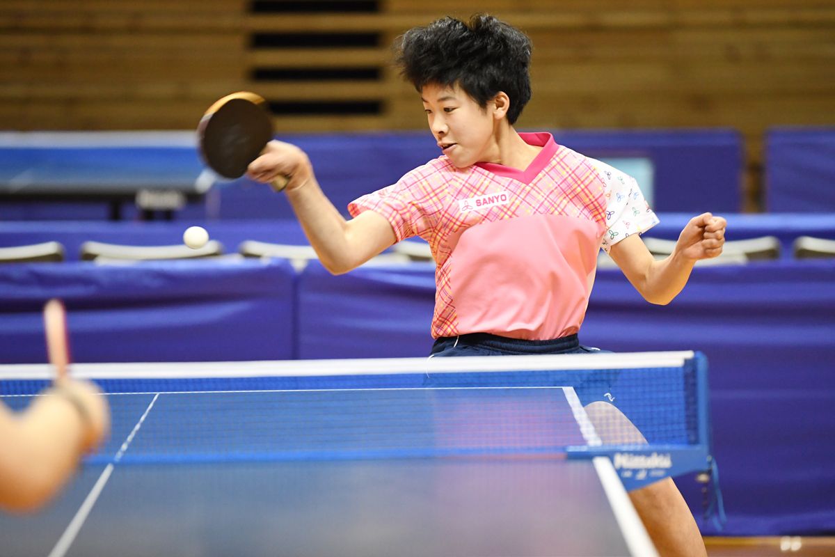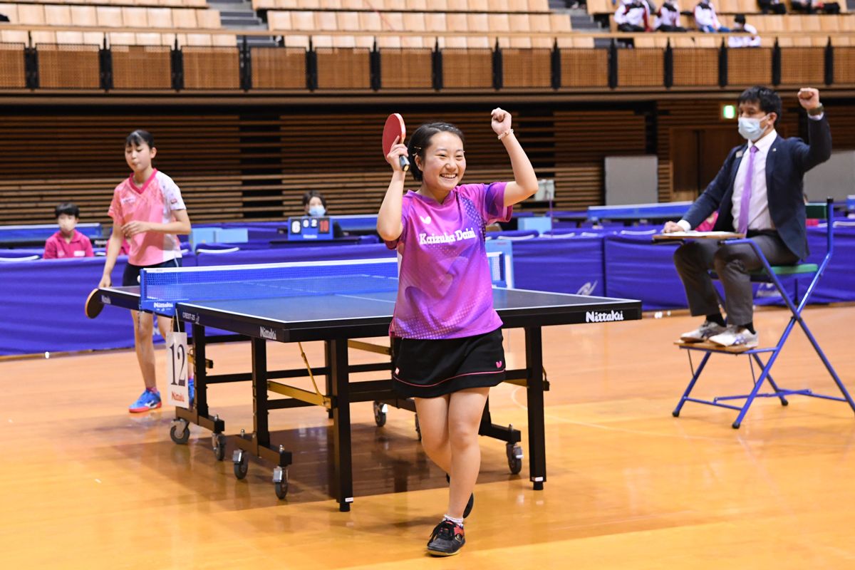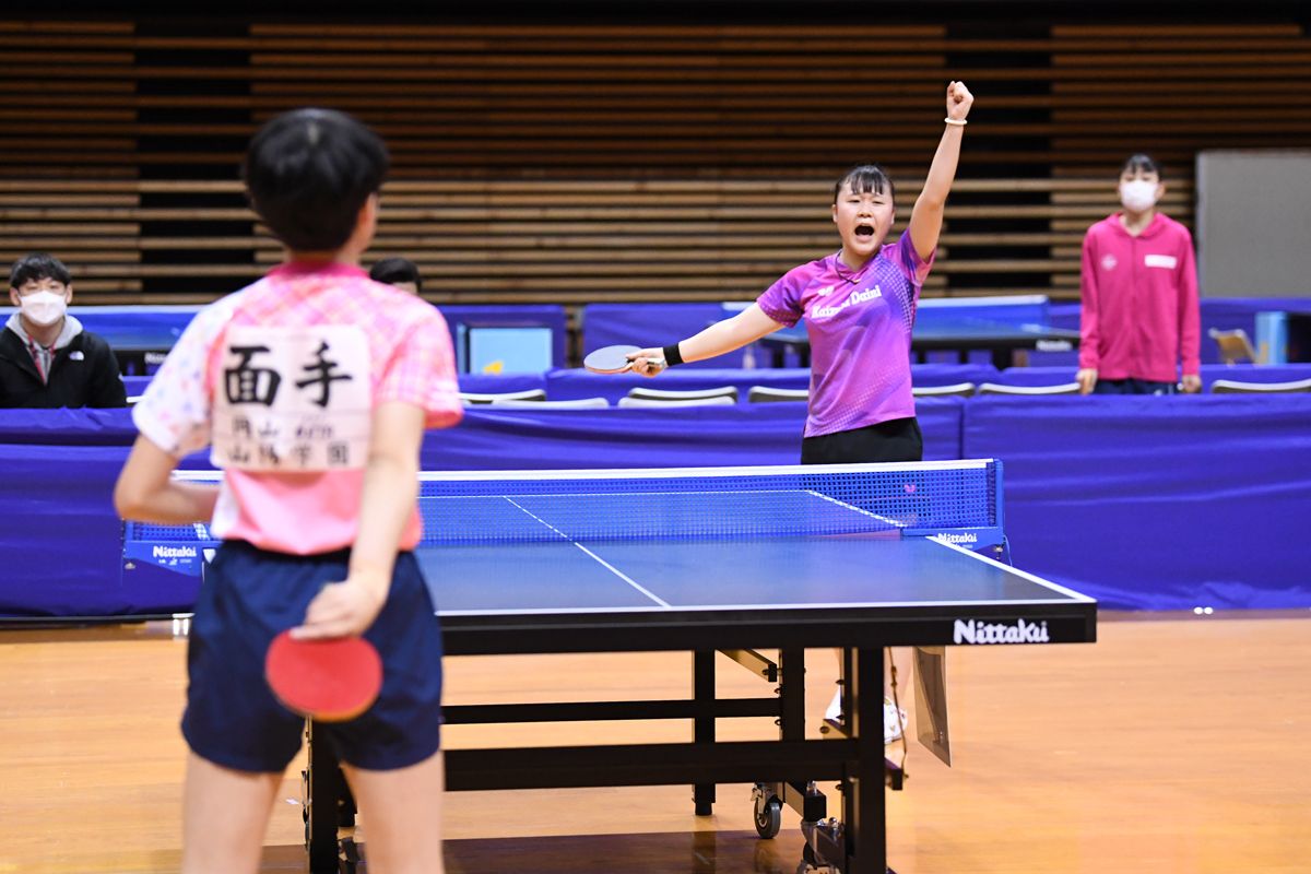 トップは樋浦がカットと攻撃を織り交ぜたプレーで先行。注目のエース対決、竹谷対面手は、ラリー巧者の面手が有利かと思われたが、バック対バックから果敢に強打で攻めた竹谷が圧倒。面手は自分のペースをつかめないまま竹谷の猛攻に圧倒された。