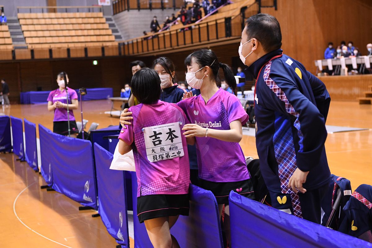 女子団体決勝は、昨年の全国中学校卓球大会で初優勝をはたした貝塚第二が、竹谷、吉本の2人のエースを擁し三連覇に臨んだ。一方の山陽学園は絶対的エースの面手を筆頭にすきのない布陣で決勝進出。個の2校の決勝は3大会連続となった。